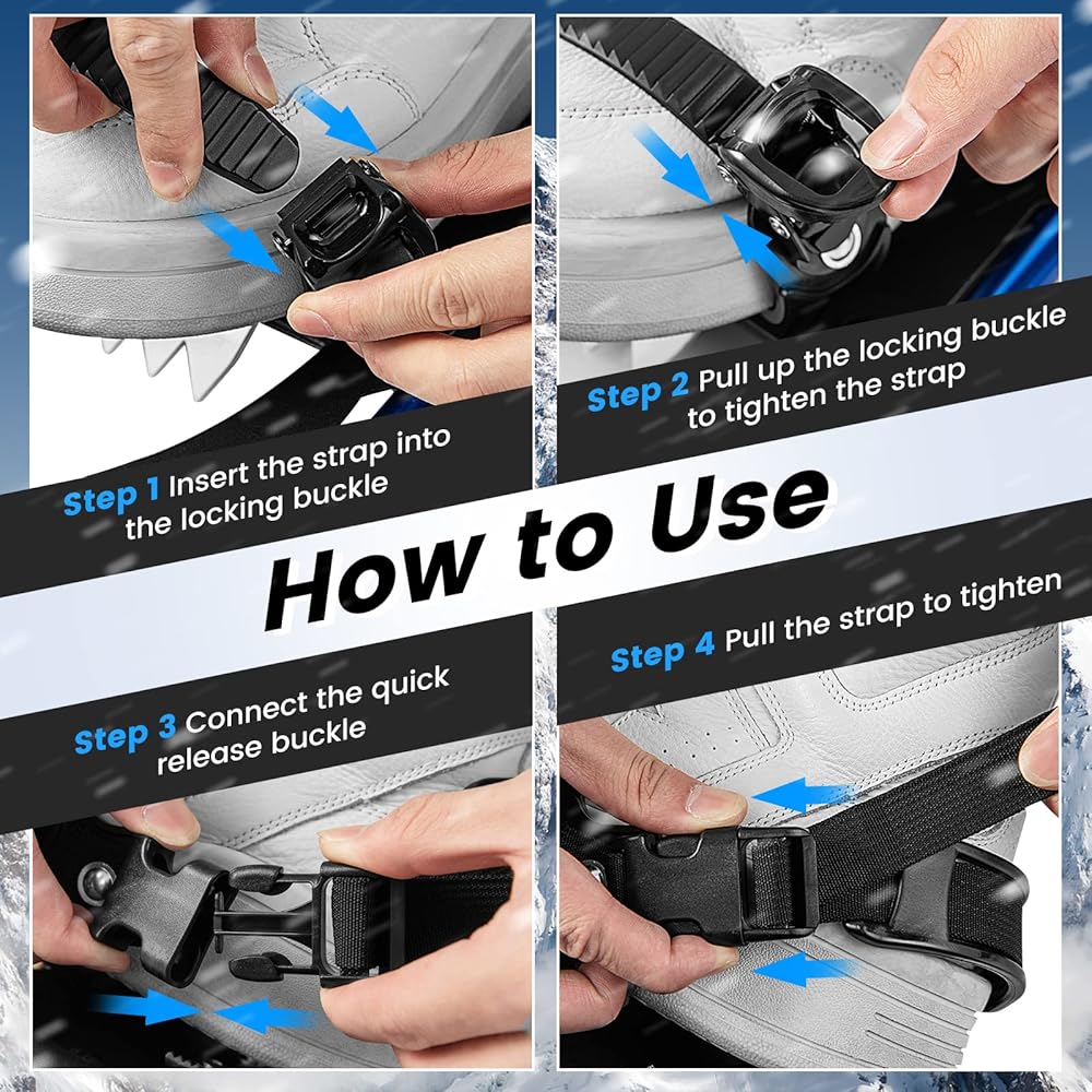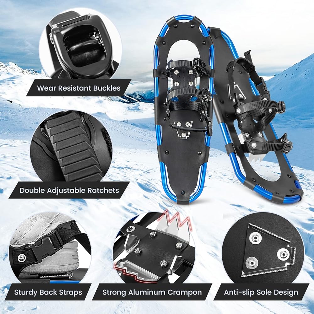 The perfect streamlined design and slightly raised tail of the snowshoes help you walk smoother and move faster. The sharp crampons provide a strong and anti-slip grip. The fully adjustable ratchet bindings and double buckles make it easy to put on and off the snowshoes while adding security. What's more, the sturdy heel strap offers efficient support, preventing your snowshoe from falling off. Made of lightweight aluminum alloy and cold-resistant PE material, each snowshoe is durable even in extreme cold winter.
