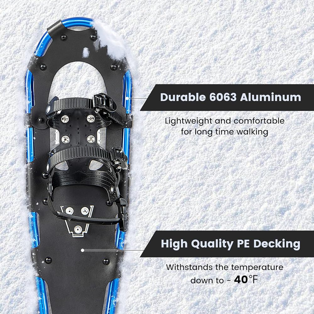 Selected Material & Lightweight Design: Constructed of heavy duty 6063 aluminum alloy frame and cold-resistant PE decking, each snowshoe enjoys superior stability and durability. What's more, this lightweight snowshoes set comes with a waterproof 600D Oxford fabric bag for easy carrying.