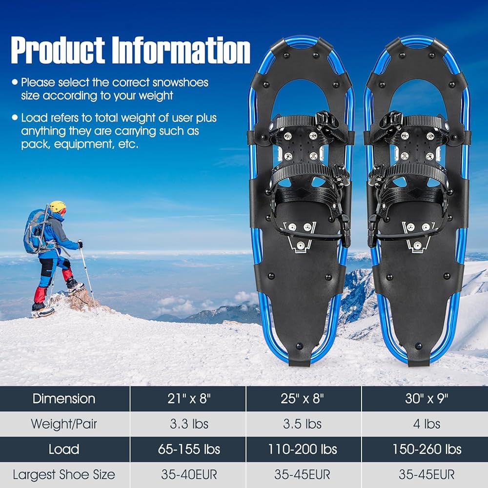 4 in 1 Snowshoe Set & Weight Capacity: The package includes 1 pair of snowshoes, 2 ski poles, 2 mud baskets, 2 snow baskets, 2 storage clips and 1 carry bag. Optimal load for each size: 21" for 65-155 lbs/30-70 kg; 25" for 110-200 lbs/50-100 kg; 30" for 150-260 lbs/70-120 kg. Please note: the load includes anything the user's carrying.