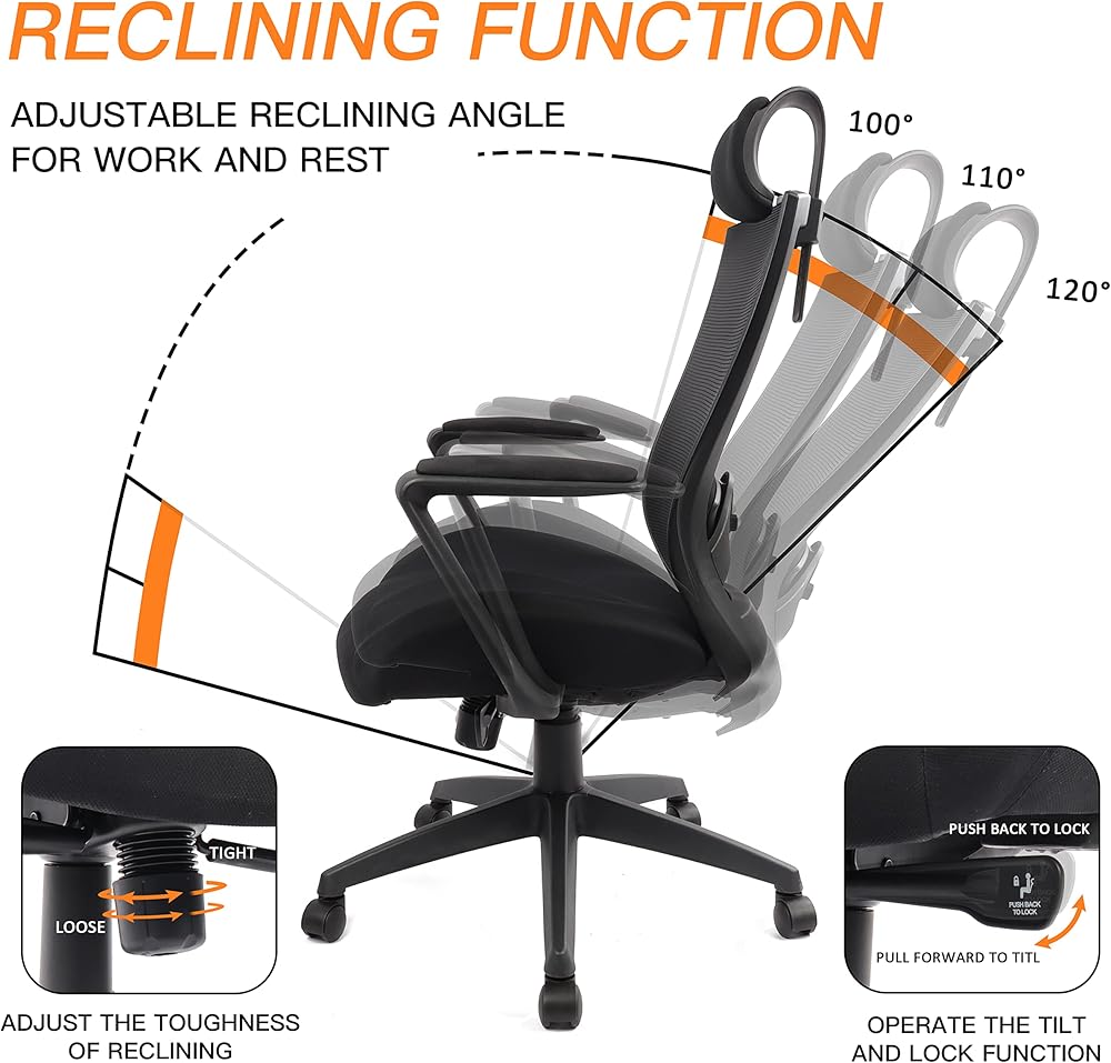 ⏩[وظيفة الاستلقاء والقفل] يمكن إمالة مسند الظهر للخلف، مما يساعد على تقليل الضغط على عضلات أسفل الظهر واسترخاء منطقة أسفل الظهر. نطاق الاتكاء هو 35 درجة (من 90 إلى 125 درجة). بالإضافة إلى ذلك، يمكنك أيضًا ضبط ذراع التحكم لقفل مسند الظهر بزاوية 100 أو 110 أو 120 درجة.