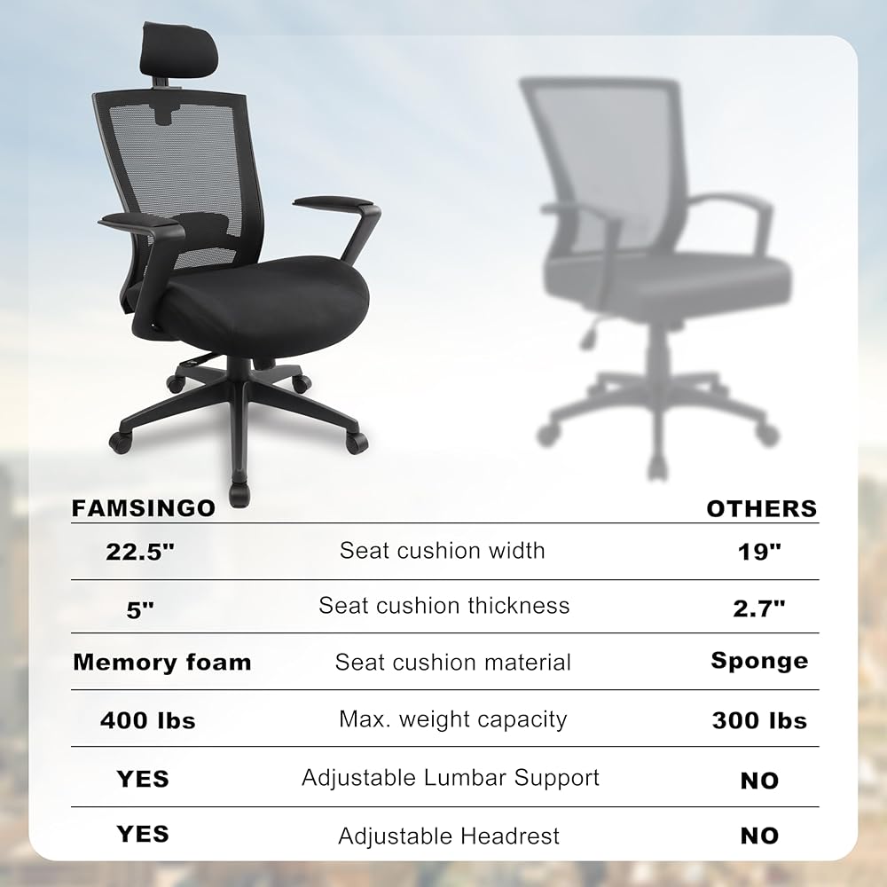 ⏩【شديد التحمل】تم اعتماد كراسي المكتب FAMSINGO بوزن 400 رطل من BIFMA وSGS. يستخدم كرسي المكتب عالي التحمل هيكلًا قويًا، ورافعة غاز من الفئة 4، وأقدام من فئة الخمس نجوم ذات قدرة تحمل قوية، وهي أكثر استقرارًا ومتانة.