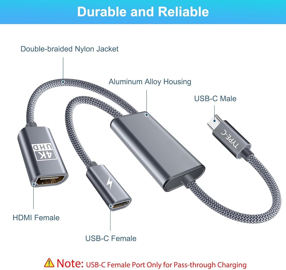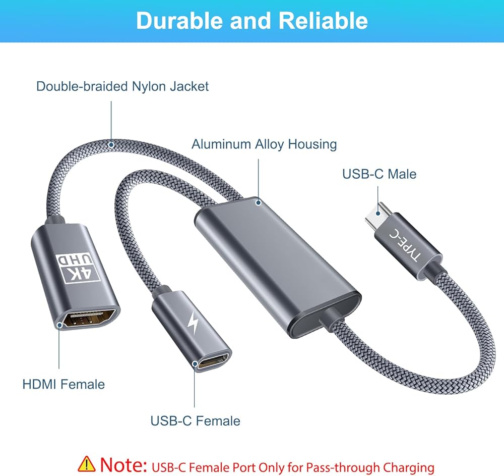 الشحن المتزامن: وداعًا لمخاوف البطارية! يتميز المحول الخاص بنا بمنفذ شحن قوي بقدرة 100 واط يسمح لك بشحن جهاز USB-C الخاص بك أثناء استخدام مخرج HDMI. يمكنك بث العروض التقديمية أو اللعب بها أو تقديمها بدون توقف دون الخوف من نفاد الطاقة.