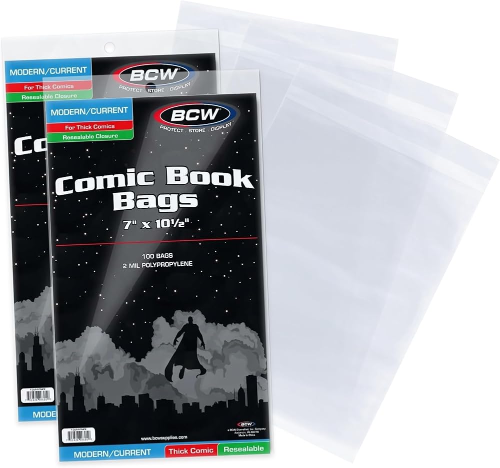 The BCW resealable current age comic bags are an acid free, Archival quality product made of crystal clear polypropylene. These bags have a reusable adhesive tape strip on the body of the bag so the collector can fold the top flap over and lock in the comic. 100 sleeve) per Pack