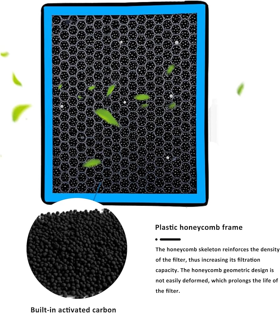 الكربون المنشط المدمج، هيكل قرص العسل يمكن أن يعزز كثافة الفلتر، وذلك لتحسين قدرة الترشيح للمرشح، التصميم الهندسي على شكل قرص العسل ليس من السهل تشوه يمكن أن يطيل عمر الفلتر.