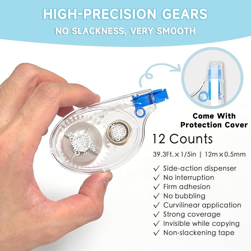 ويتم تعزيز متعة العمل من خلال نافذة العرض الشفافة المزودة بعجلات تروس مرئية. لتجنب التشابك والعبث بأدواتك المكتبية الأخرى، يأتي شريط التصحيح من CINBOS مع غطاء شريطي واقي.