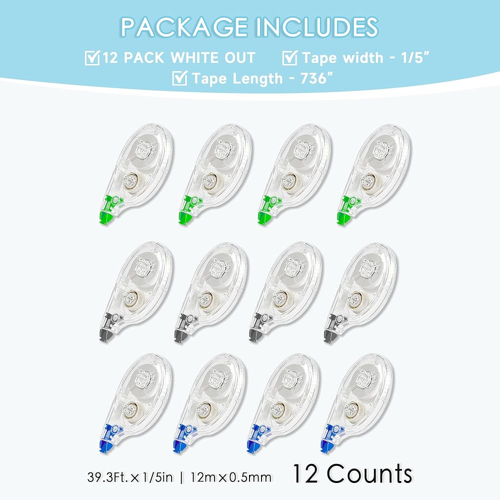 تشتمل على: 12 × شريط تصحيح - قياسات الشريط: 1/5 بوصة × 787 بوصة. خط واحد، شريط تصحيح مقاوم للكسر. حجم صغير لحقيبة الأقلام وحقائب الظهر والمخططات وما إلى ذلك. يتم تطبيقه على نطاق واسع على سجل القصاصات وبطاقات المعايدة والمذكرات والقرطاسية المدرسية ومستلزمات تصحيح الكتابة.