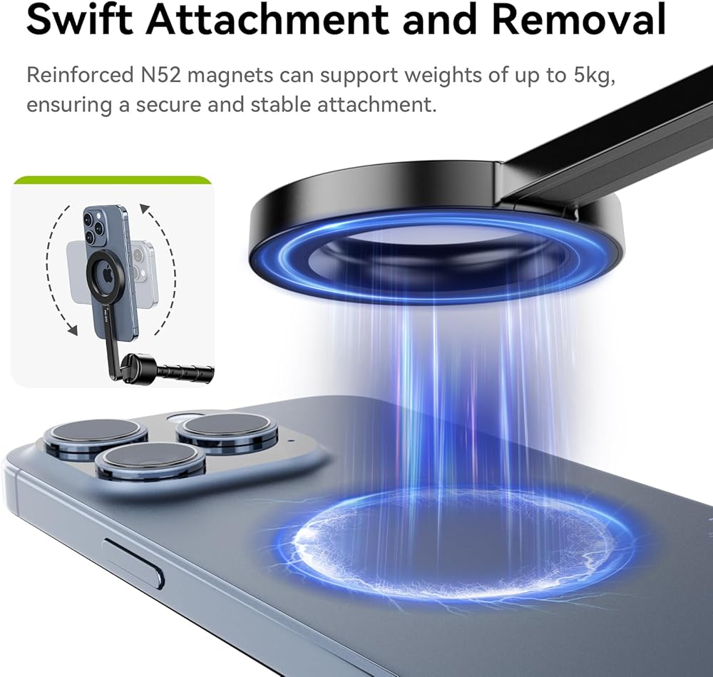 【Magsafe & Magnetic Adhesion】the magnetic phone tripod stand comes with 54N magnet, strong adhesion, quick attach in 1 second, capture amazing moments effortlessly, offering on-the-go convenience wherever you are