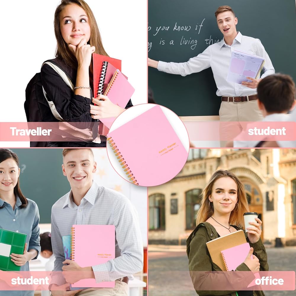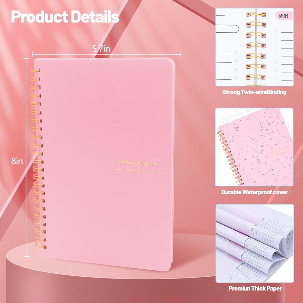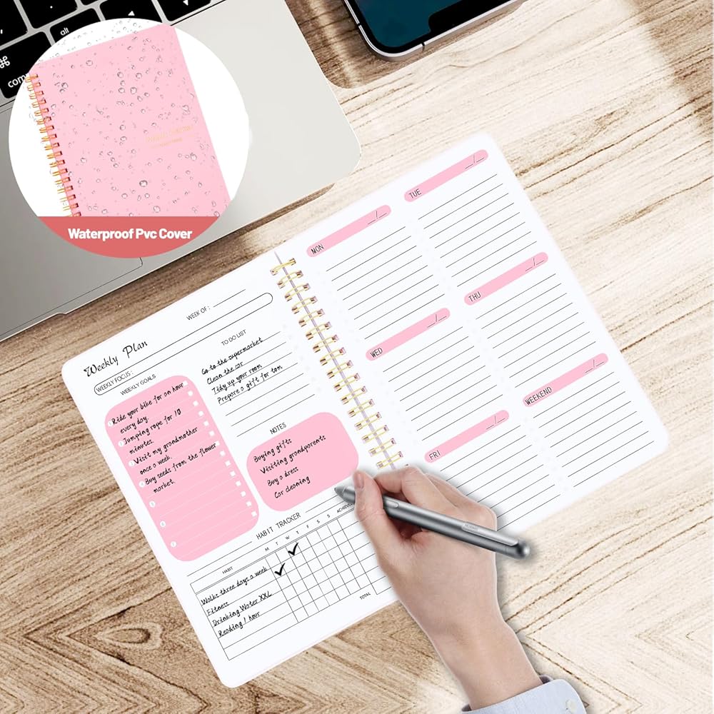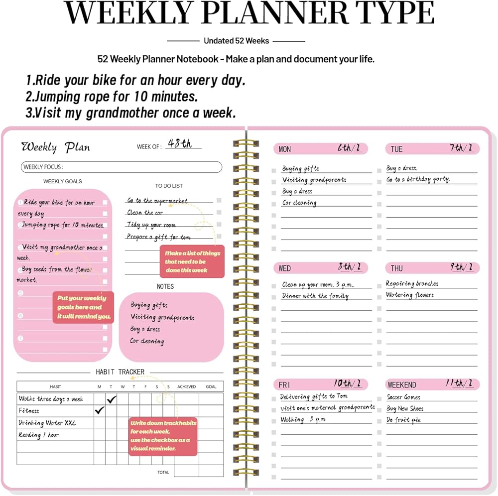 دفتر الأهداف الأسبوعي، مخطط غير مؤرخ يجعل من السهل عليك بدء المخطط في أي وقت خلال العام، دون إهدار المساحة. صفحتان منتشرتان لكل أسبوع، مع الأولوية الأسبوعية، والمراجعة الأسبوعية، وتتبع العادات، والامتنان، للقيام به، والملاحظات قسم لكل أسبوع. مثالي للمخططين المشغولين. قم بإدارة وقتك واشعر بالراحة بعد التخطيط لأسبوعك.