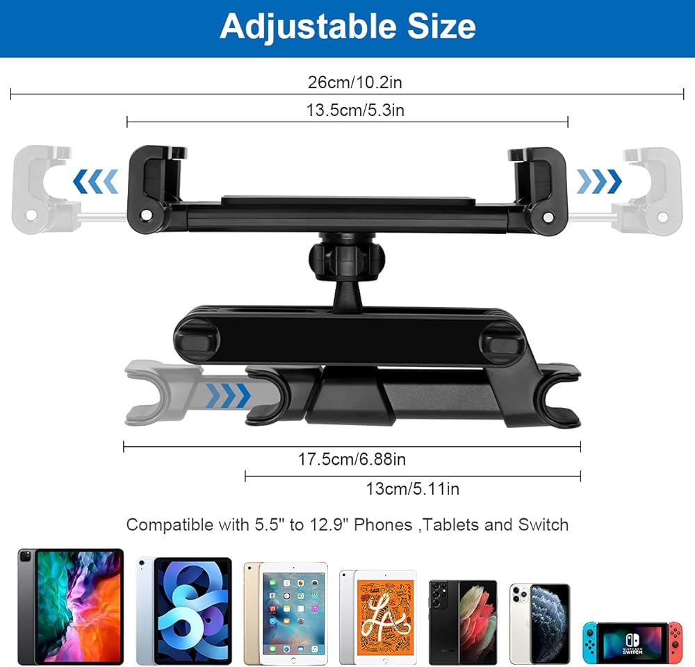 [صلب ومتين] - يمكنه حمل الهاتف في اتجاهات/زوايا مختلفة دون أي شعور فضفاض! بطانة مطاطية ناعمة تحمي أجهزتك وسيارتك من الاحتكاك. ويحتوي حامل مسند الرأس للسيارة على ذراع تثبيت، والذي يمكنه دعم الشاشات الكبيرة مثل أجهزة iPad بشكل فعال. حتى في حالة وعرة، لن ينحني بسهولة.