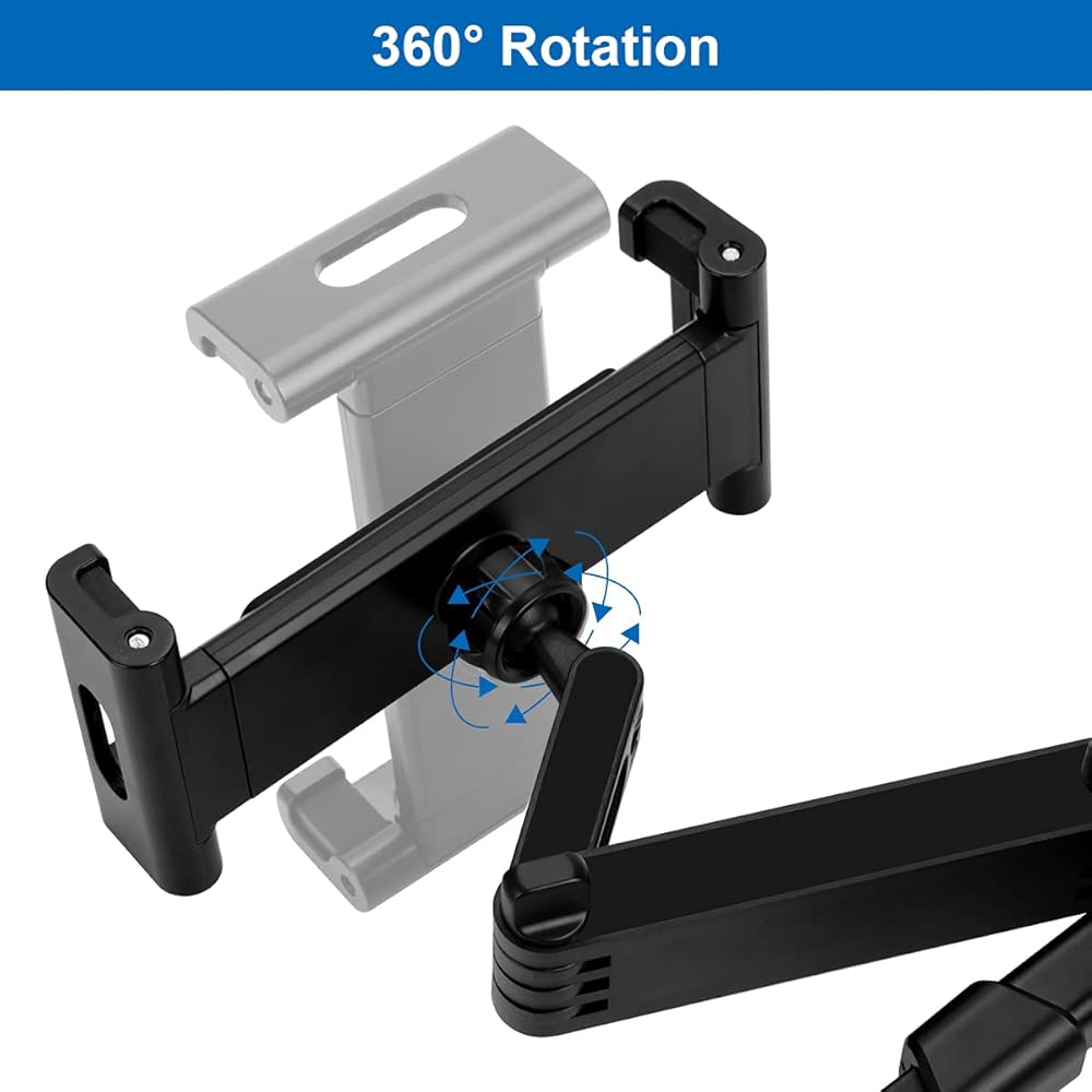 [قابل للدوران 360 درجة] - يمكن تعديل دعم الجهاز اللوحي 360 درجة، وهو مناسب لك لضبط الزاوية المناسبة في أي وقت. يمكن أن تتمدد بسهولة حتى 10.6 بوصة بحد أقصى (27 سم)، ويمكنك ضبط أفضل وضع رؤية ومسافة مريحة، مما يجعل رحلتك أسهل.