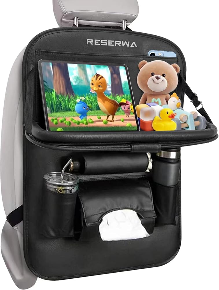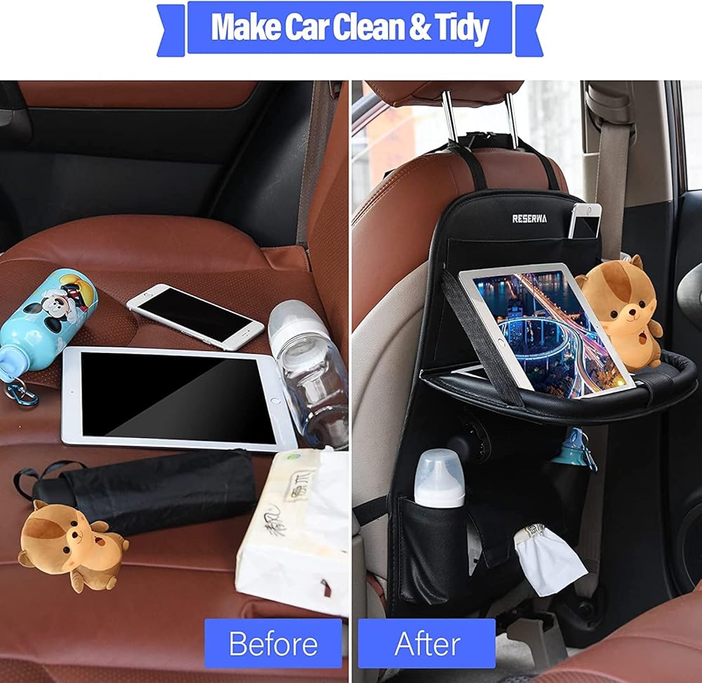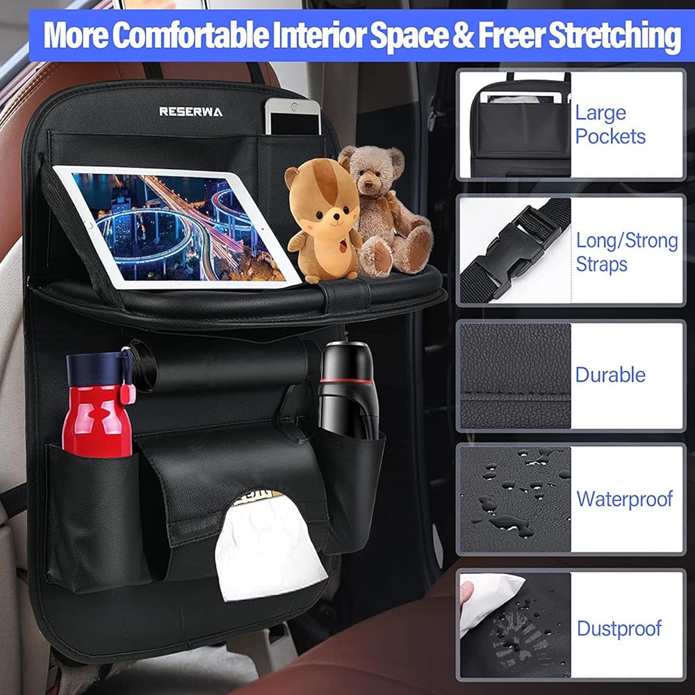 منظم المقعد الخلفي للسيارة من جلد البولي يوريثان مع صينية طاولة قابلة للطي، منظم السيارة مع صندوق مناديل/كوب/حامل مظلة، سجادات منظم المقعد الخلفي للسيارة، استخدام عالمي لإكسسوارات السفر للأطفال في السيارة