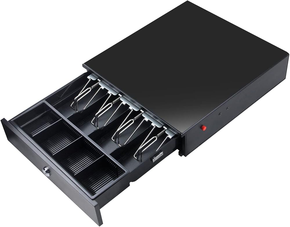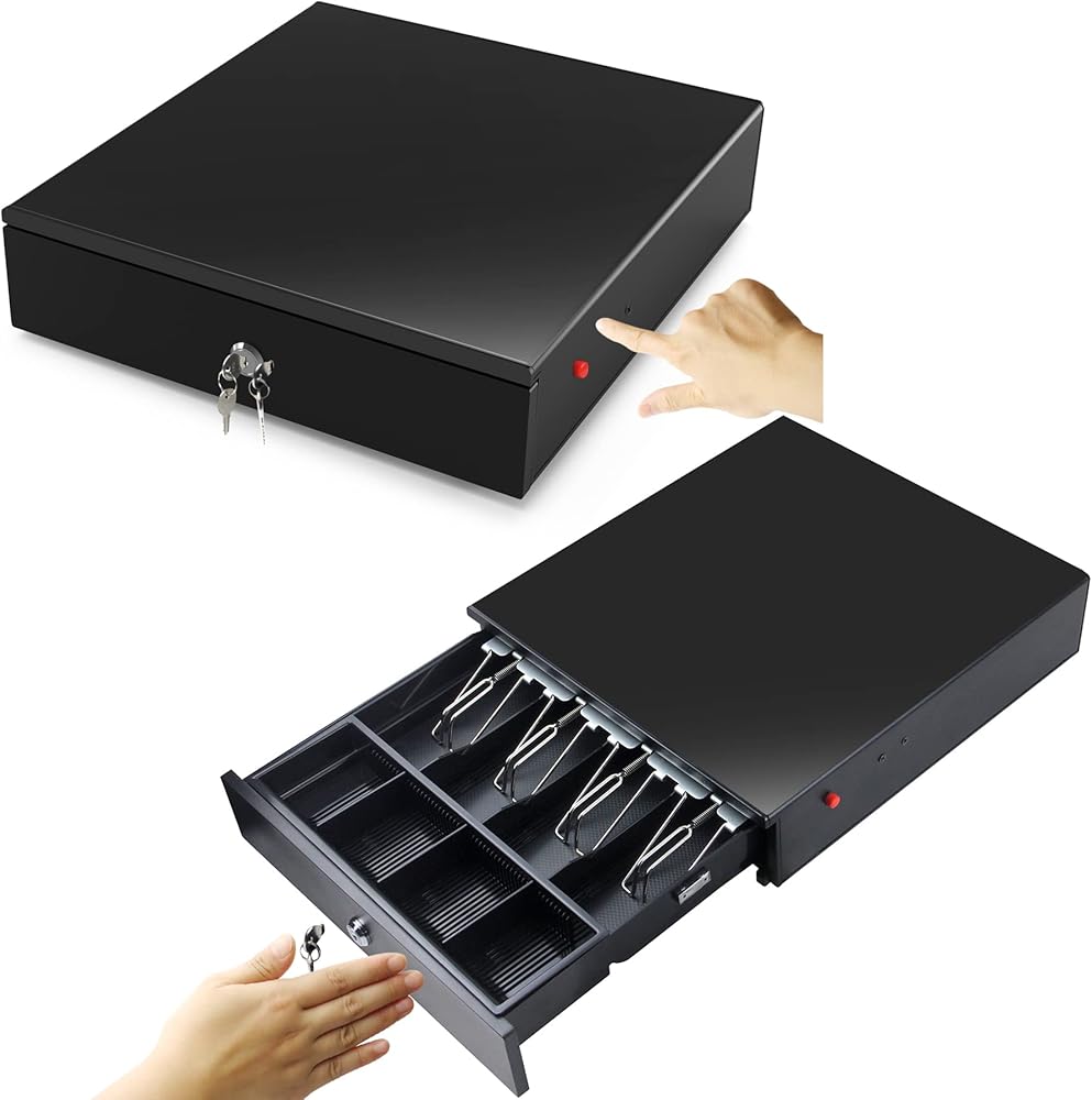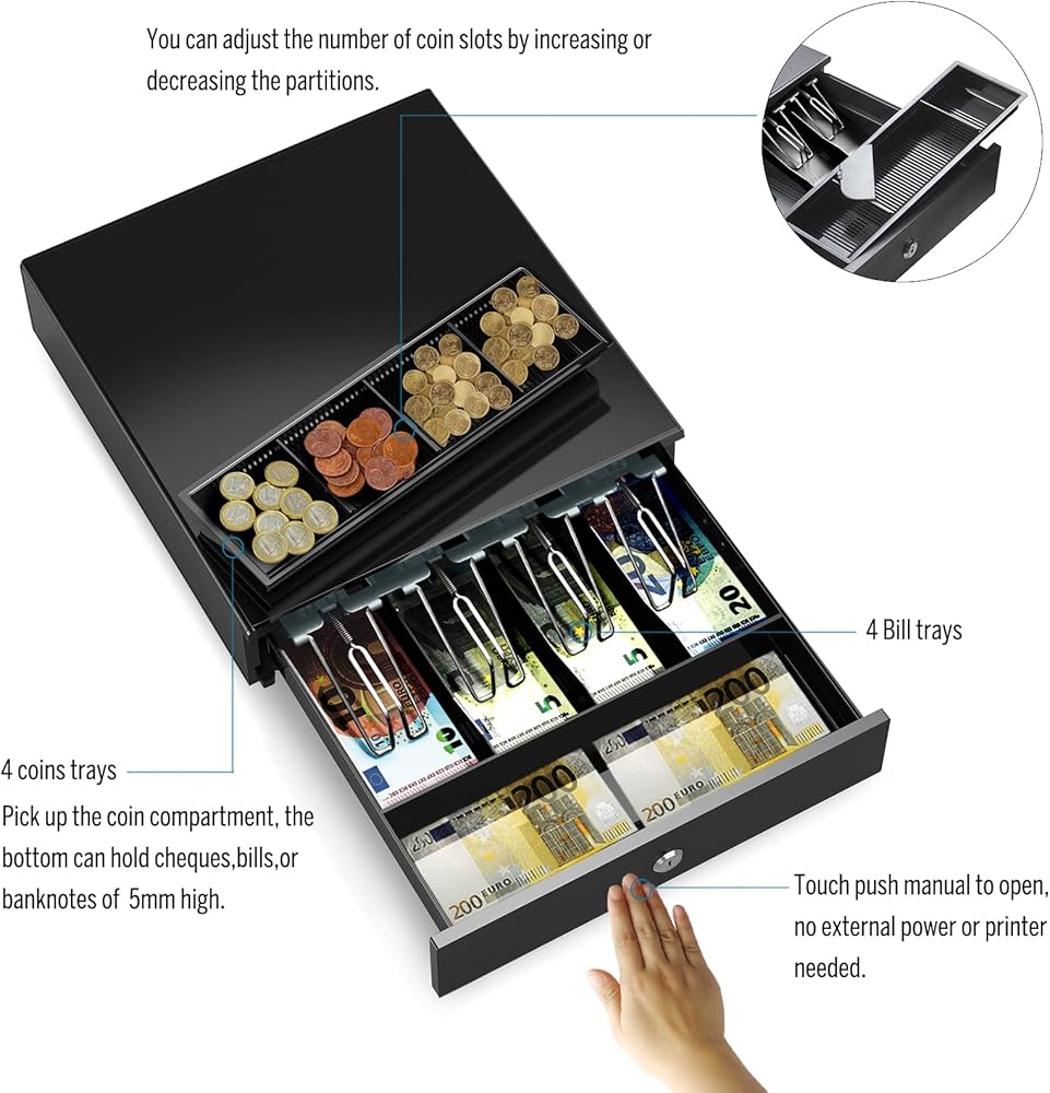 This cash drawer is ideal for use in low volume retail environments, schools, clubs, churches and other non-profit organizations.Made of heavy gauge steel, suitable for heavy duty use and prolonged operational life. No external power supply. Key open and Push-Button open. Adjustable and removable 4 bills and 8 coins cash tray with metal wire grippers, making it worldwide comaptible. Package Include: 1* manual cash drawer.
