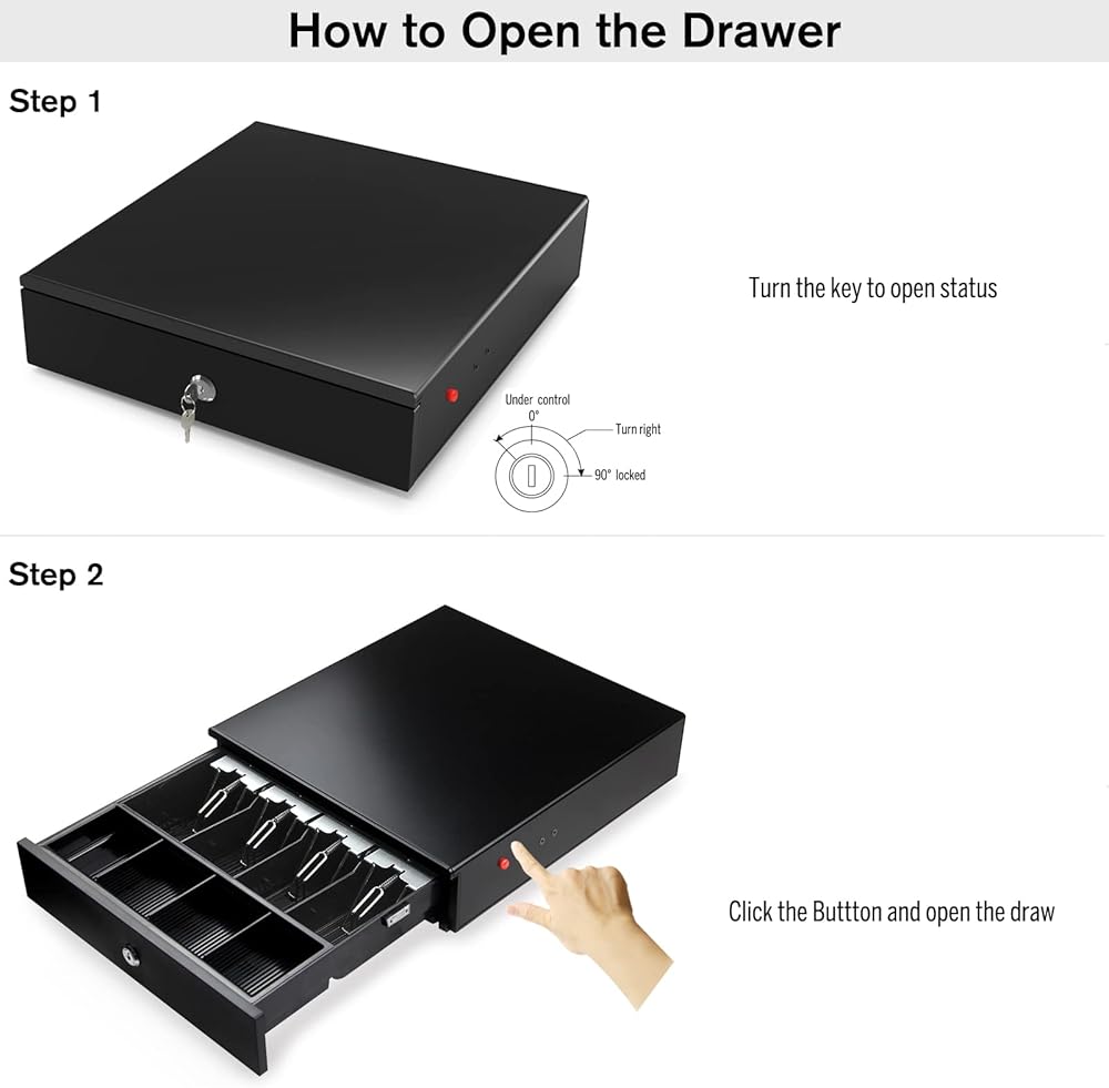 Push open / close by the button, lock the draw with key, no external power or printer needed; / Drawer can't be push open if it is locked by key;