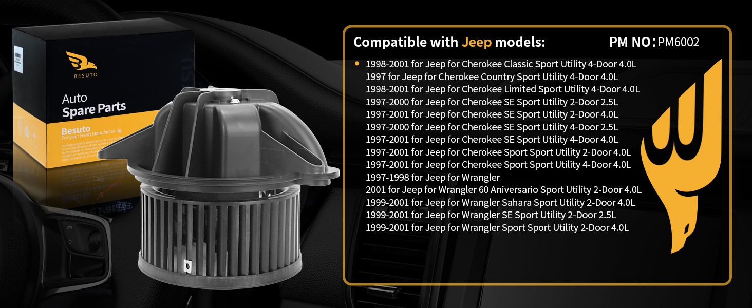 هذا المحرك منفاخ سخان التيار المتردد مناسب لسيارة جيب 1998-2001 شيروكي كلاسيك آند ليمتد سبورت فائدة 4 أبواب 4.0 لتر / شيروكي SE سبورت فائدة 2 باب 2.5 لتر / شيروكي SE سبورت فائدة 2 باب 4.0 لتر / 1997-2000 شيروكي SE سبورت فائدة 4 -باب 2.5 لتر/شيروكي SE Sport Utility 4 أبواب 4.0L/Sport Sport Utility 2 (4)-باب 4.0L; 1999-2001 رانجلر صحارى سبورت فائدة 2 باب 4.0L / 1999-2001 رانجلر SE سبورت فائدة 2 باب 2.5L / 1999-2001 لسيارة جيب لسيارة رانجلر سبورت فائدة 2 باب 4.0L