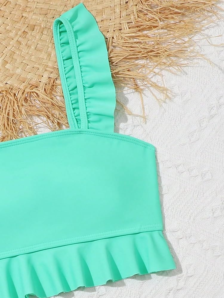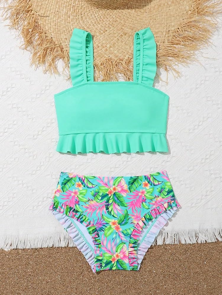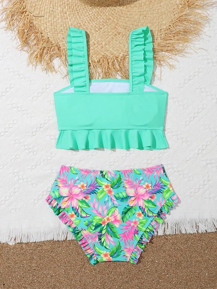 بدلة سباحة للفتيات من SOLY HUX مكونة من قطعتين بطباعة زهور ومزخرفة بكشكشة طقم بيكيني لبدلات الاستحمام