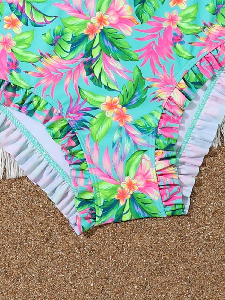 - السمات: طباعة زهور، زخرفة مكشكشة، أشرطة، حمالة صدر لاسلكية، ملابس سباحة للفتيات، عصرية