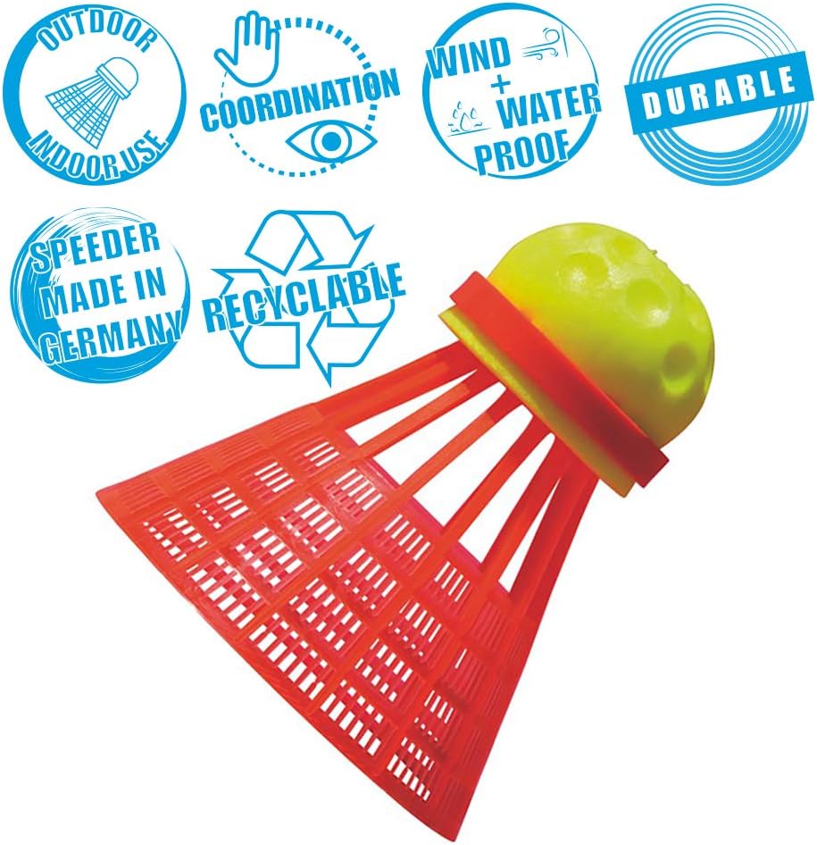 Speeder 2015 – quality Made in Germany The FUN Speeder with its red dress is the lightest of all Speeder types. It is therefore suitable for beginners, children and for training purposes. The newest generation of the Speeder displays outstanding flight characteristics: the Speeder flies steadily through the air across both long and short distances even when it is windy or rainy. The Speeder from Speedminton are exclusively produced in Germany using only high-tech synthetic recyclable materials from Switzerland making it environmental friendly.