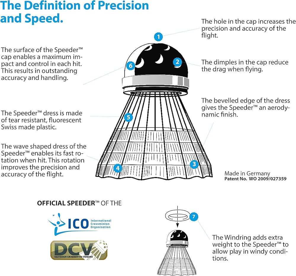 Compared to conventional shuttlecocks the Speeder is smaller and heavier. This allows a game over long distances, regardless of wind and weather.