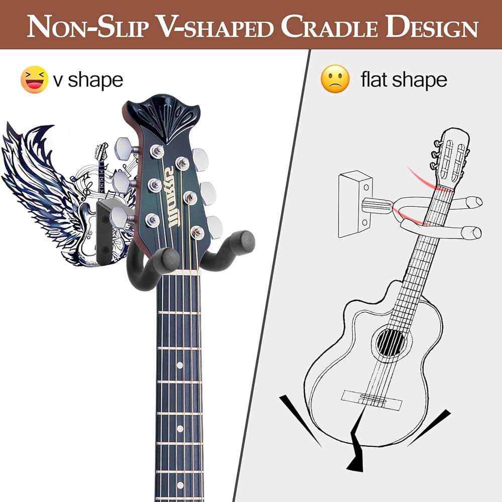 تصميم كلاسيكي على شكل حرف V ووسادات سيليكون ناعمة، تمنع وضع الجيتار الخاص بك بشكل غير صحيح أو أي خدوش. تعمل شماعة الجيتار هذه بشكل جيد مع الجيتار الصوتي والكهربائي، وجيتار الجير، والمندولين والبانجو.