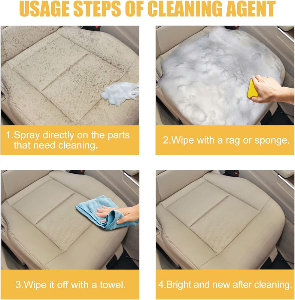 [سهل الاستخدام]: ما عليك سوى رش المنظف مباشرة على المنطقة المرغوبة. امسح بمنشفة أو إسفنجة حتى تتم إزالة البقعة. لا حاجة للشطف. بعد التنظيف، فقط امسحي الرغوة بمنشفة. امنح التصميمات الداخلية لسيارتك ومنازلك مظهرًا جديدًا!