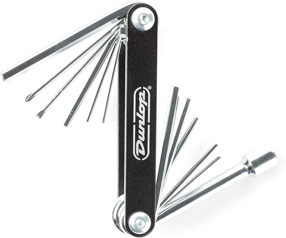 Bundle includes 2 patch cables, Dunlop 1046 nickel wound electric guitar strings, string winder, and Dunlop DGT02 Multi-Tool with screwdriver, socket wrench, and hex key