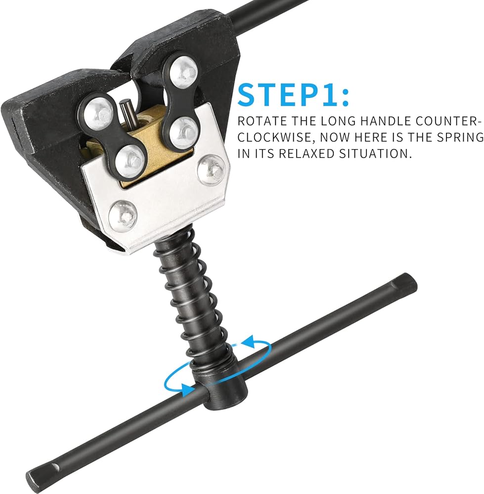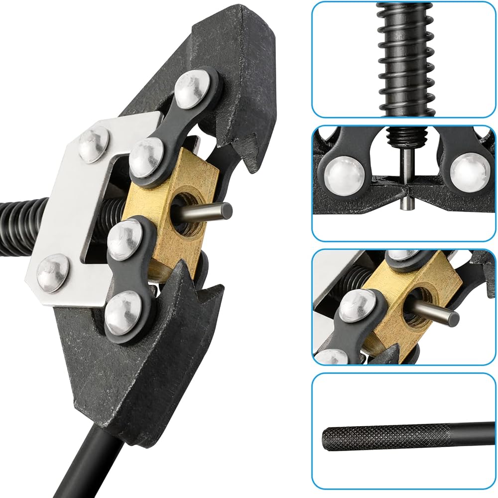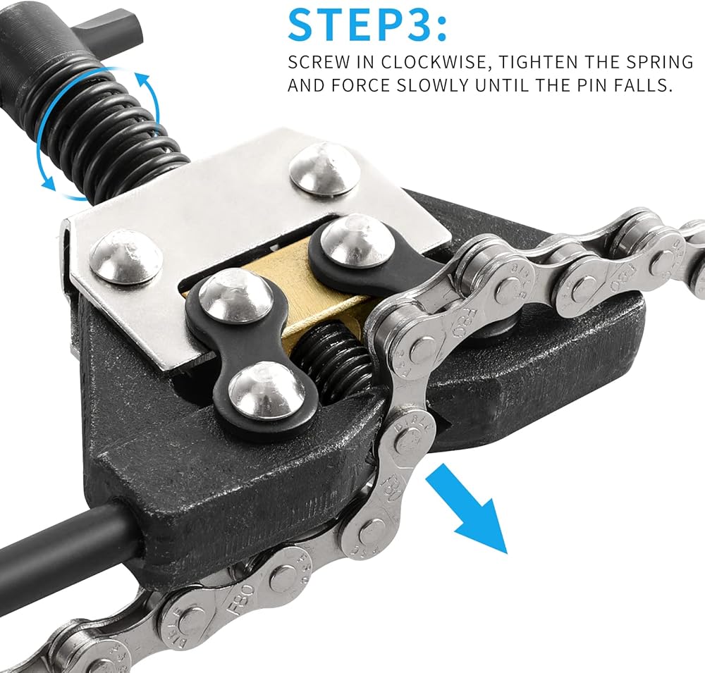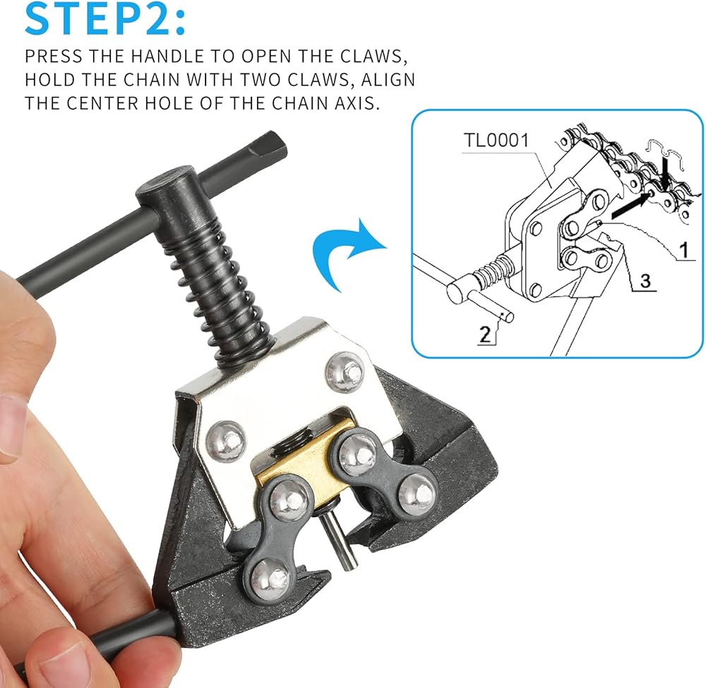 How to use: Squeeze the handles together to open the jaws. Place jaws around the link you want to break. Release the jaws. The pin should be over the pin in the chain. Turn the handle and the pin of the chain break will push the pin in the chain out