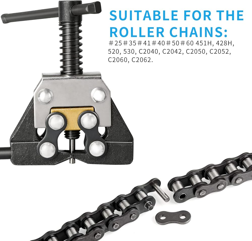 This chain breaker is for #25 #35 #40 #41 #50 320 410 415 420 520 525 530 roller chain, work with motorcycle bicycle go cart mini bike dirt bike motor bike chain etc.