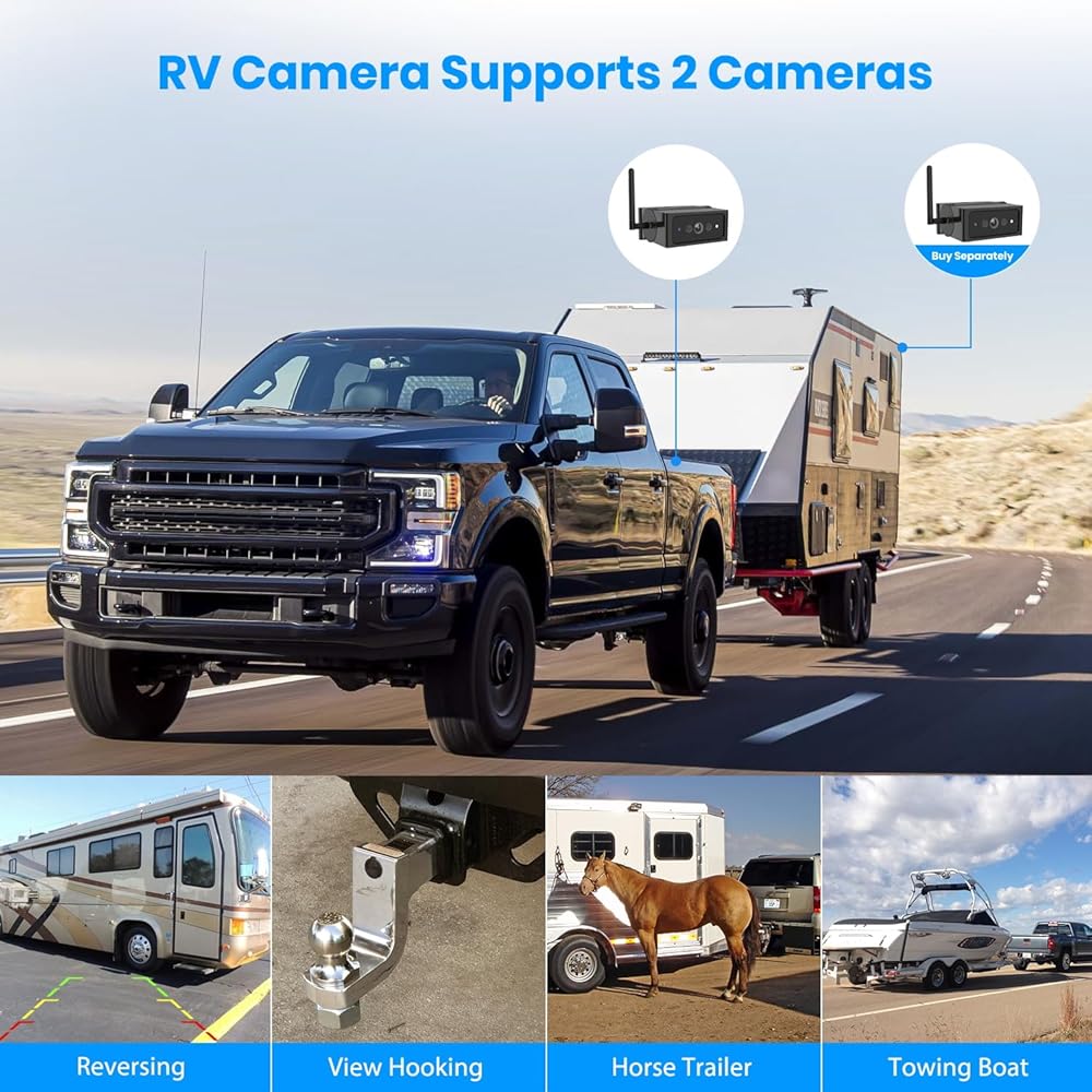 【Spport 2 قنوات وشاشة منسكبة】يمكن للكاميرا الاحتياطية اللاسلكية RV أن تدعم كاميرتين للتغطية الكاملة والعرض في وضع الشاشة المقسمة، والتي يمكن استخدامها للعرض العكسي/الخلفي أو الرؤية الثابتة طوال الوقت. تعرض كاميرا المقطورة زاوية رؤية واسعة لتجنب النقاط العمياء لتعزيز القيادة الآمنة.