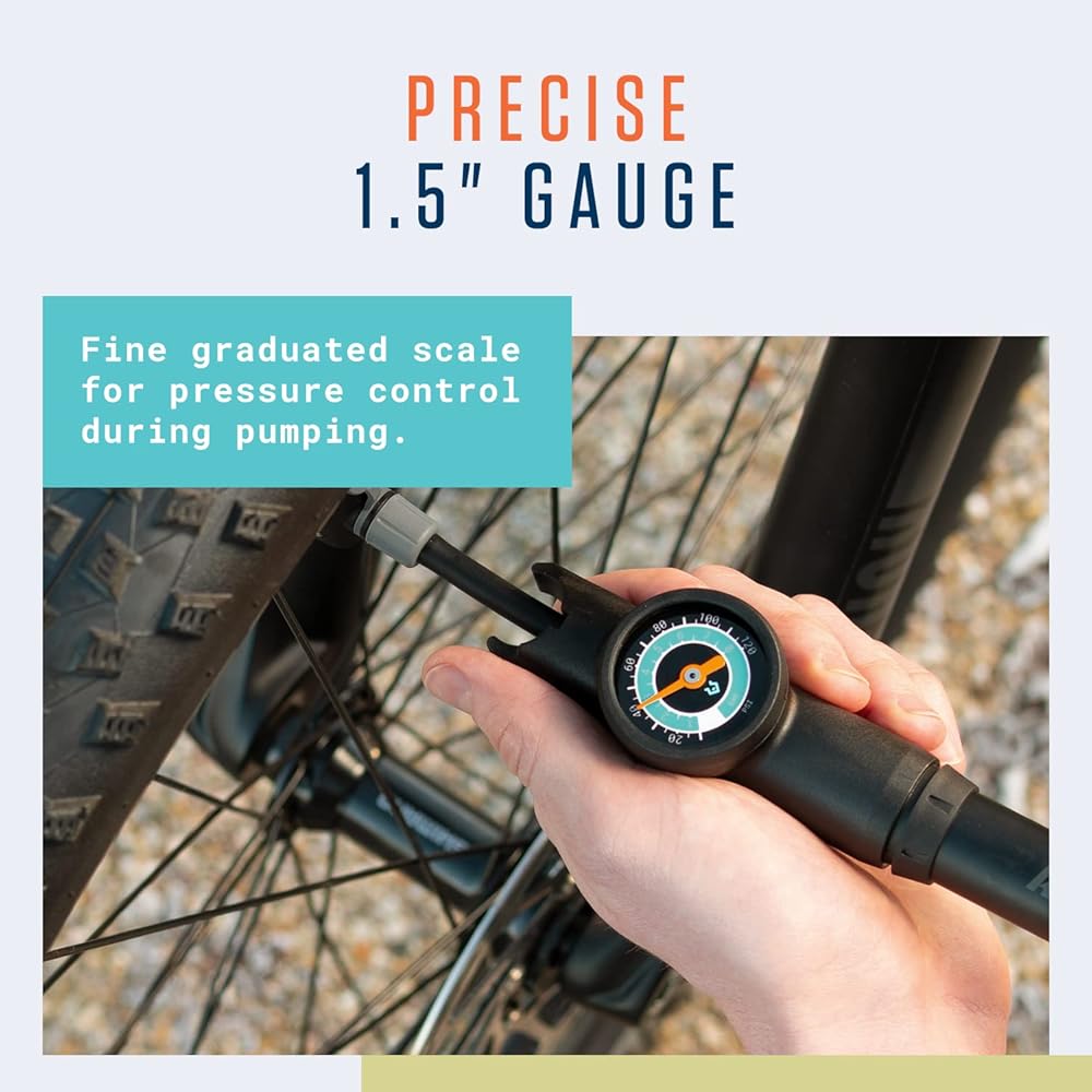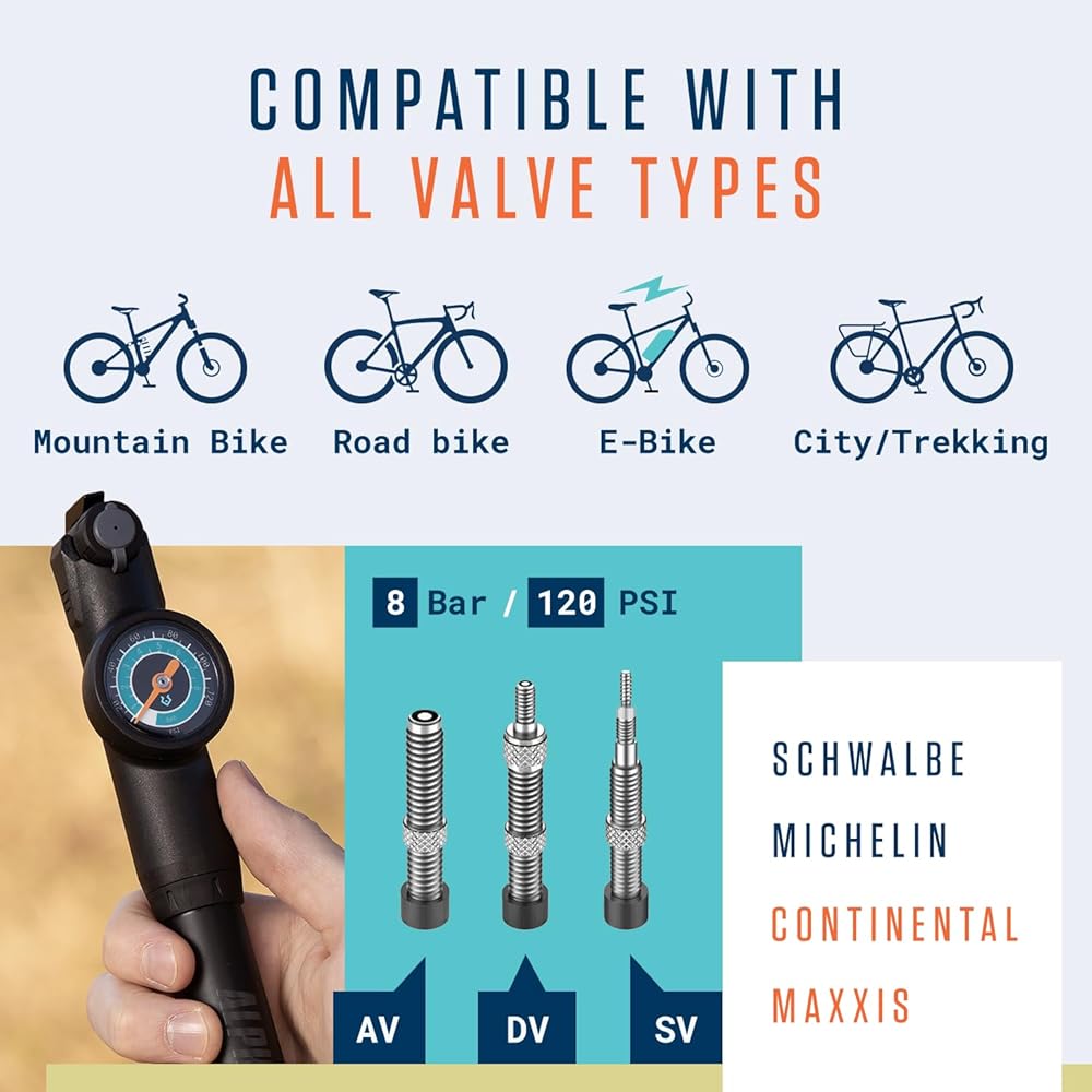 لجميع الصمامات - المضخة الصغيرة ذات الحشوة القابلة للعكس تناسب صمامات بريستا (SV) وشرايدر (AV)، ومع المحول المتضمن أيضًا صمامات دنلوب (DV). يمكنه التعامل مع ضغط يصل إلى 8.3 بار (120 رطل لكل بوصة مربعة). مثالية لدراجات المدينة أو الرحلات أو الطرق وMTB.