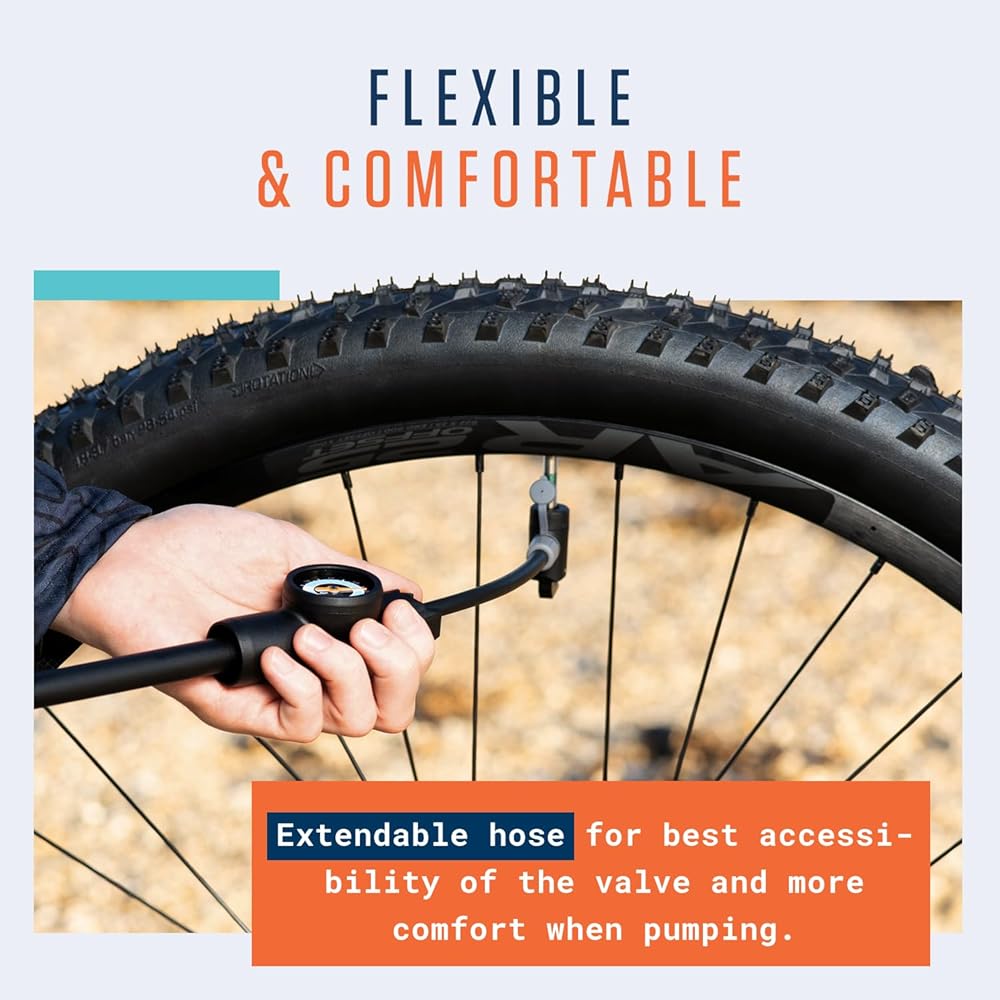 مرنة ومريحة - رأس المضخة مع رافعة قفل على الخرطوم، والتي يمكن تمديدها حتى 15 سم، تسمح بضخ مريح حتى مع الصمامات التي يصعب الوصول إليها. يوفر المقياس الدائري القابل للدوران 360 درجة مقاس 1.5 بوصة (قطر 32 مم) رؤية مثالية للضغط الحالي من كل زاوية.