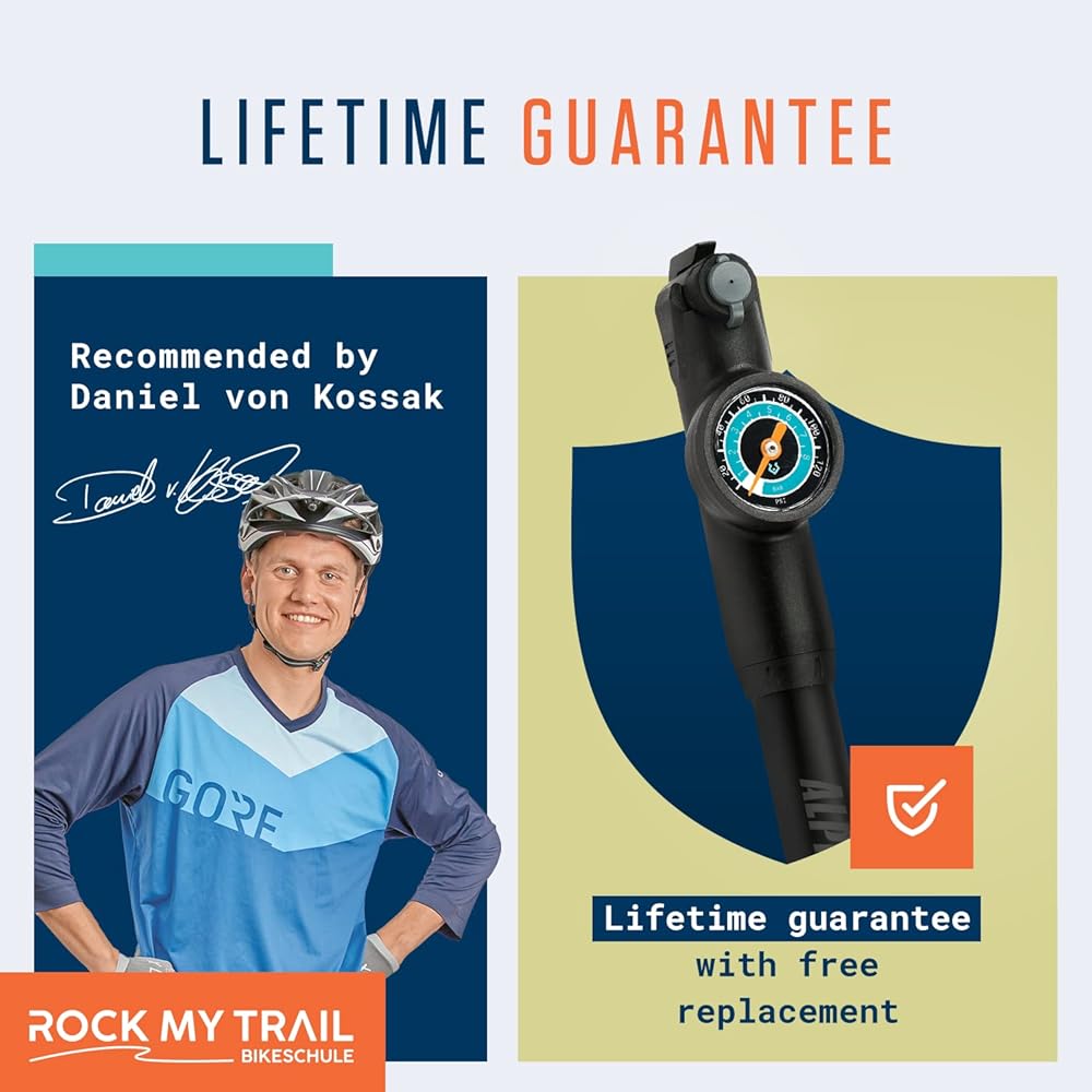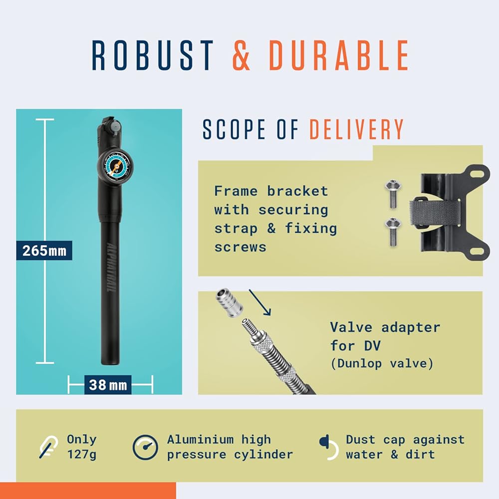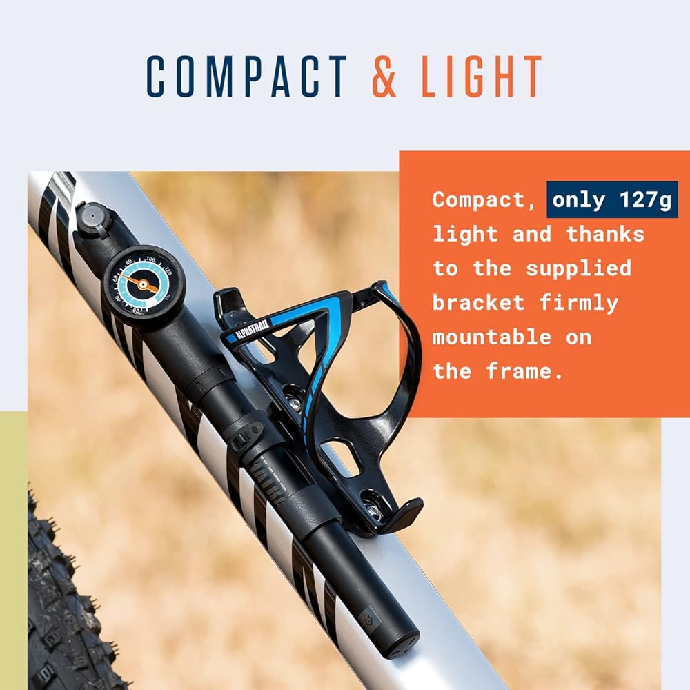 مضخة صغيرة مع رأس مضخة قابل للاستخراج - لجميع الصمامات I 120 PSI لصمام Presta وSchrader وDunlop I مع مقياس الضغط I بما في ذلك. حامل الإطار I مضخة دراجة لMTB، والرحلات، والدراجة الإلكترونية ودراجة الأطفال