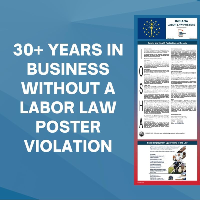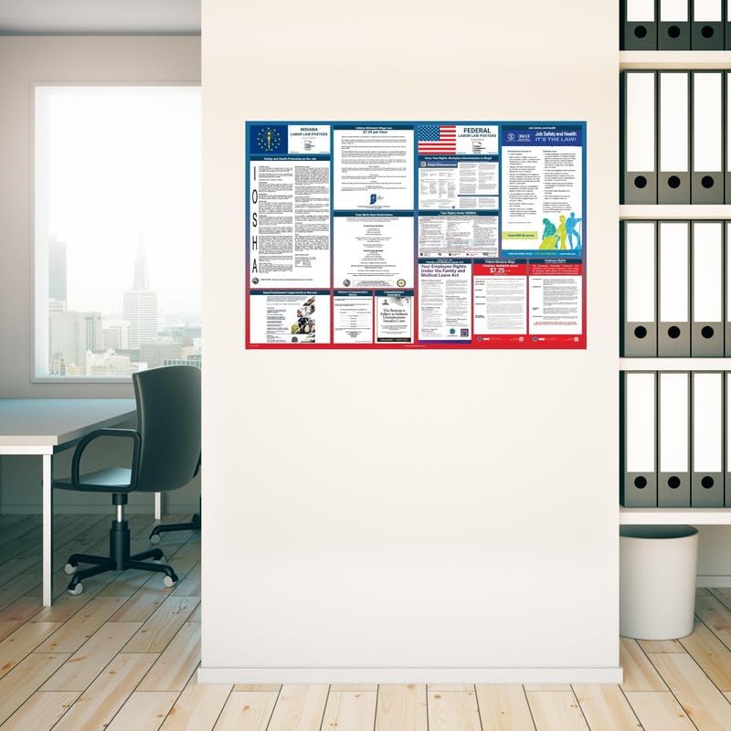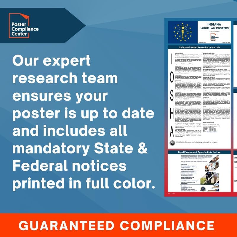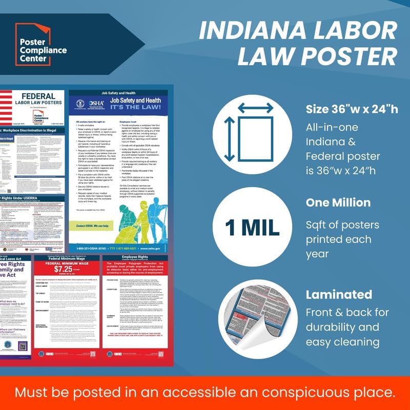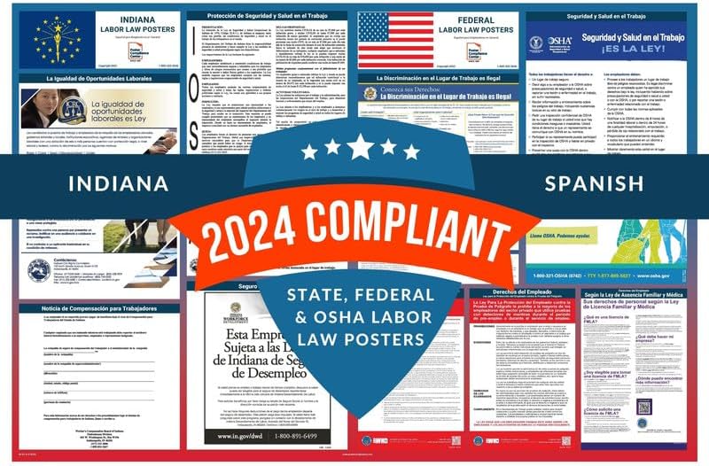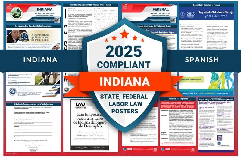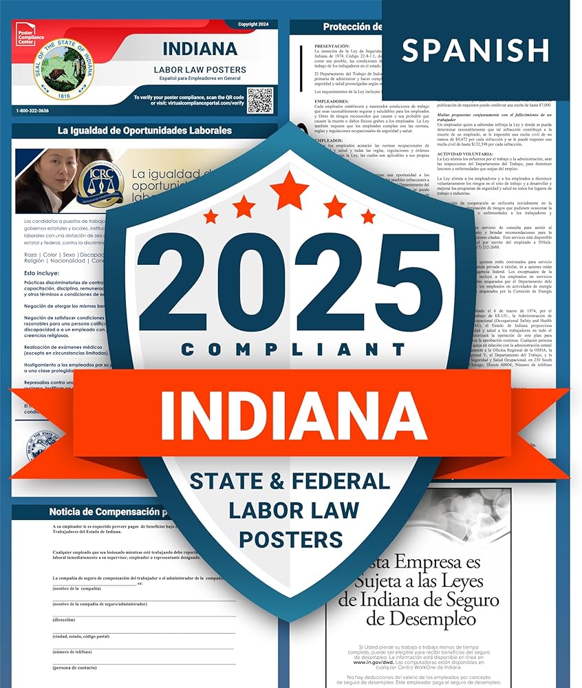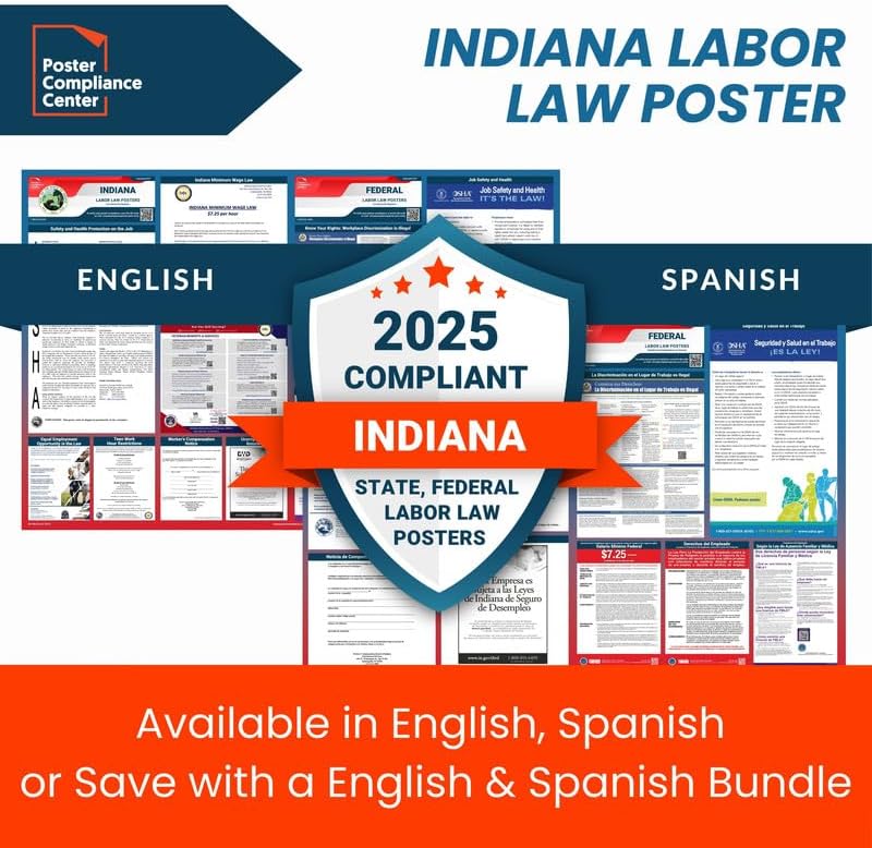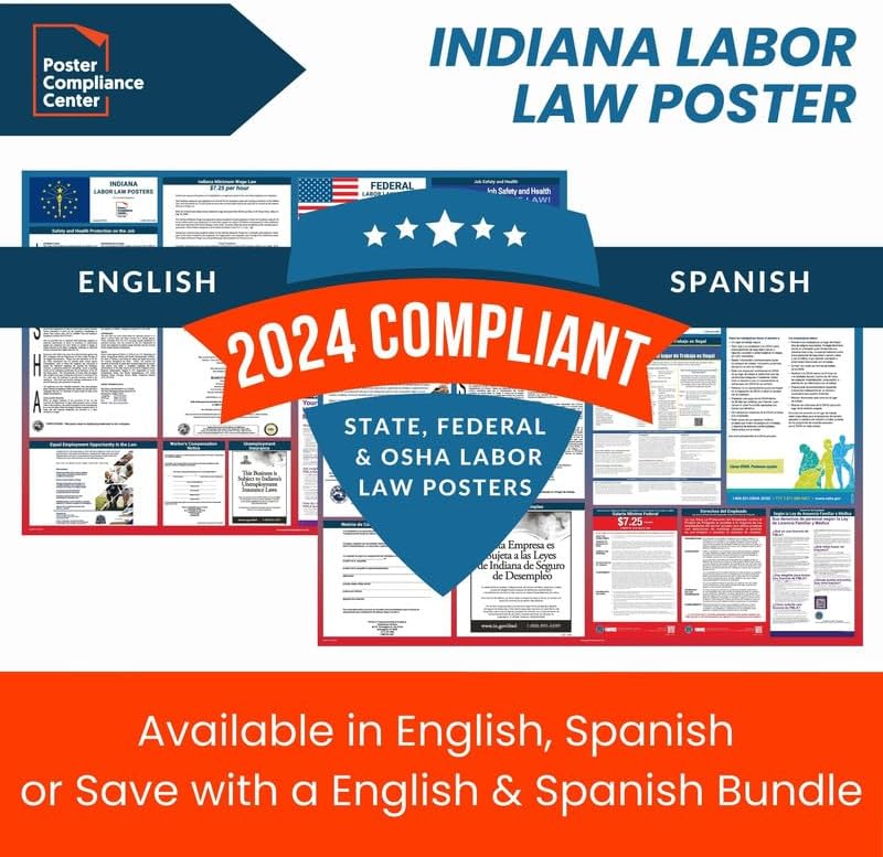 تتوفر لغة مزدوجة: جميع إشعارات ولاية إنديانا والفيدرالية الإلزامية الحالية على ملصق باللغة الإنجليزية، أو ملصق باللغة الإسبانية، أو حزمة حزمة مع كلا الملصقين. من المهم التأكد من أن جميع العاملين لديك يفهمون حقوقهم بموجب قانون العمل.