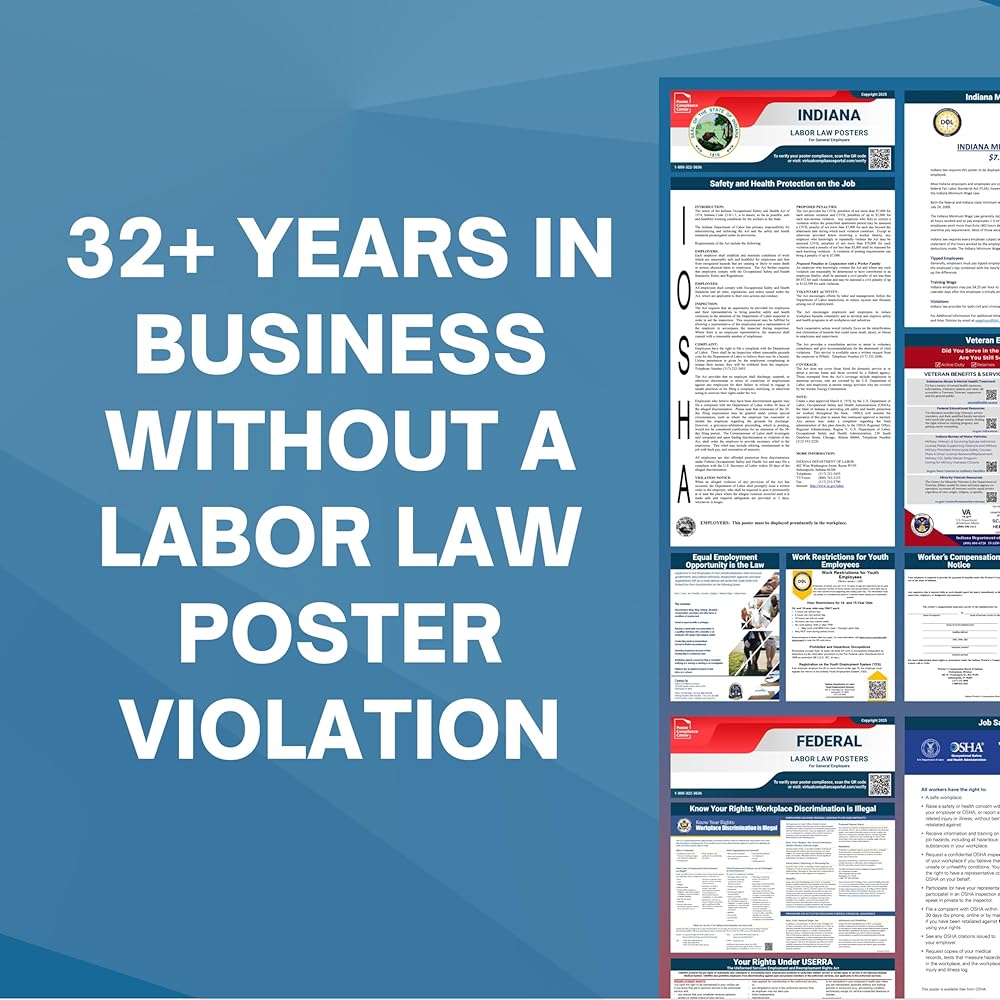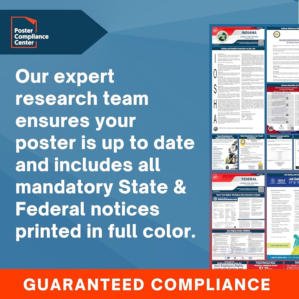 الامتثال والدقة المضمونة: أحدث ملصق لقانون العمل الفيدرالي وولاية إنديانا لعام 2024 مع جميع الإشعارات في تصميم واحد مبسط. عرض إشعارات مثل الحد الأدنى للأجور، OSHA، USERRA، تعويض العمال، FMLA، التمييز في مكان العمل غير قانوني، والمزيد. يتم تدقيق إشعارات الامتثال الخاصة بنا بشكل منتظم - على مدار أكثر من 30 عامًا من العمل، لم نتعرض مطلقًا لانتهاك قانون العمل!