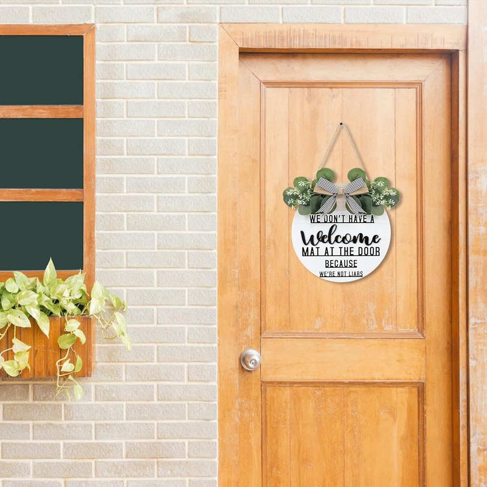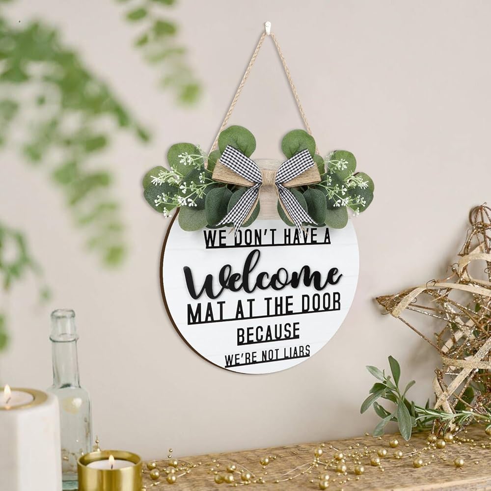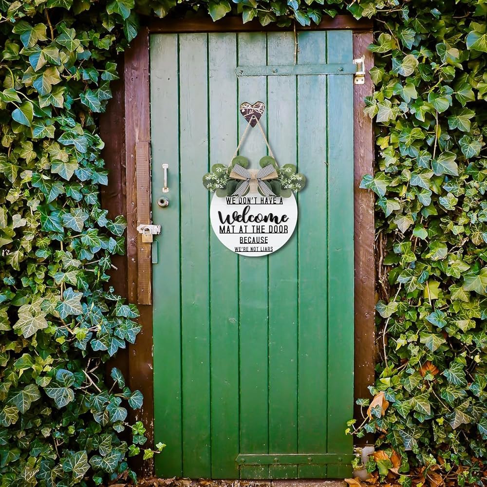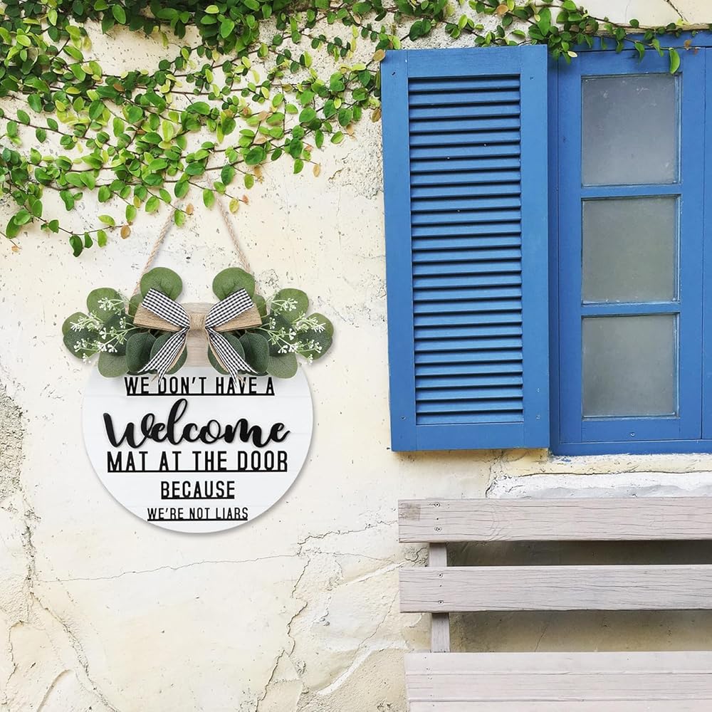 CHDITB ليس لدينا سجادة ترحيب عند الباب لأننا لسنا كذابين إكليلًا (11.42 بوصة × 11.42 بوصة)، لافتة ترحيب ثلاثية الأبعاد مضحكة مع أوراق الأوكالبتوس المدفوعة الأجر، ديكور للتدفئة المنزلية لمدخل الشرفة