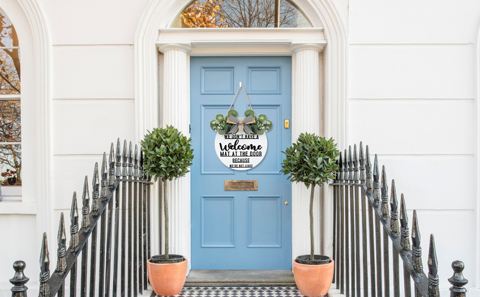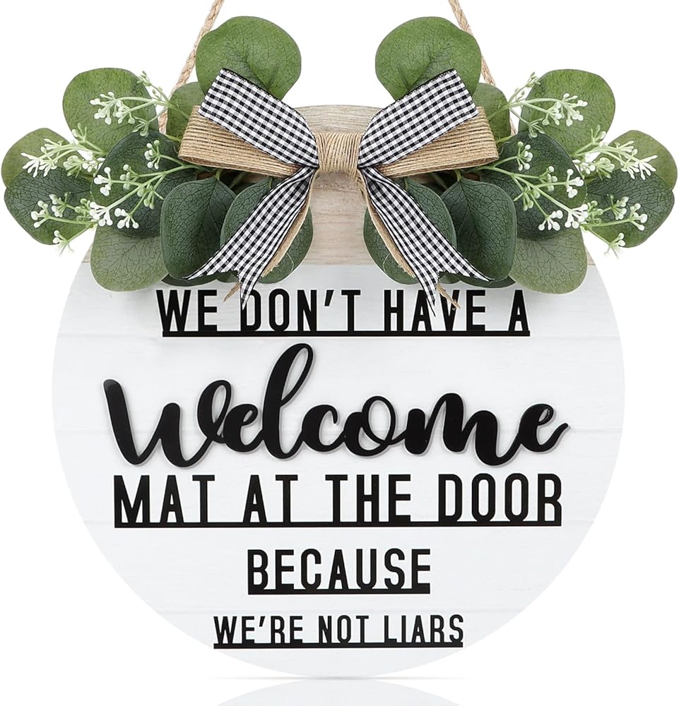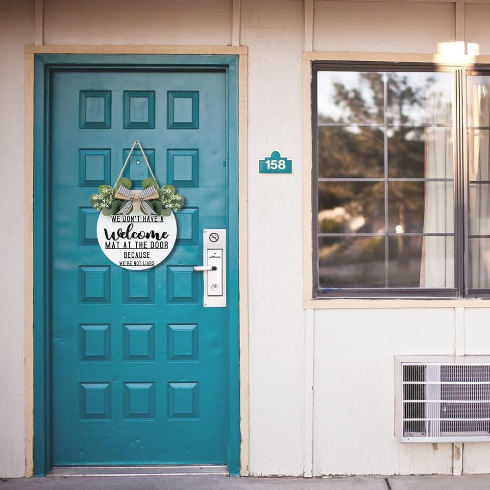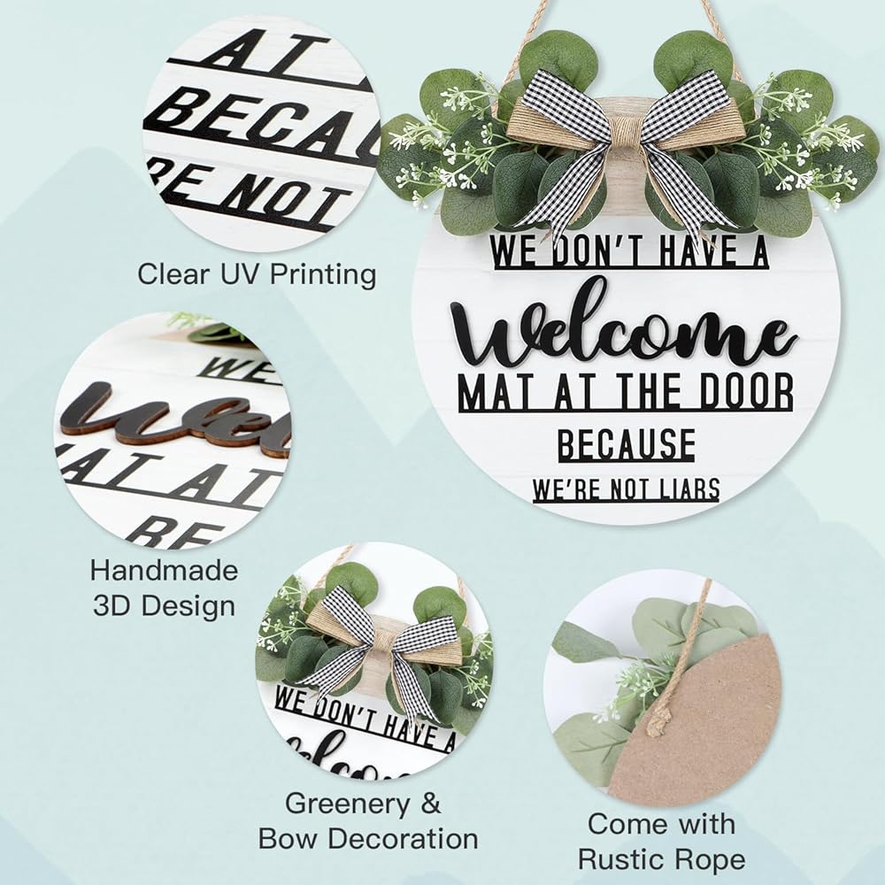 CHDITB ليس لدينا سجادة ترحيب عند الباب لأننا لسنا كذابين إكليلًا (11.42 بوصة × 11.42 بوصة)، لافتة ترحيب ثلاثية الأبعاد مضحكة مع أوراق الأوكالبتوس المدفوعة الأجر، ديكور للتدفئة المنزلية لمدخل الشرفة