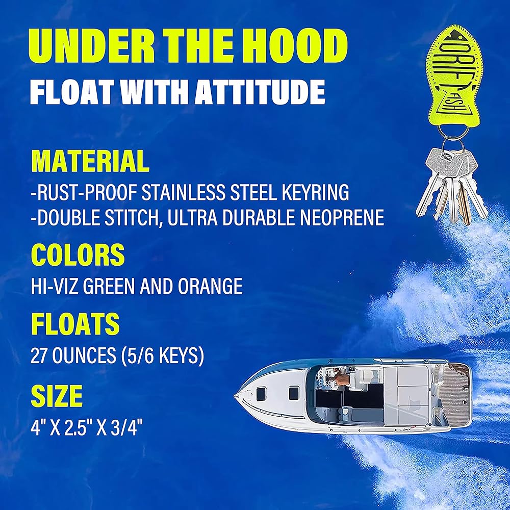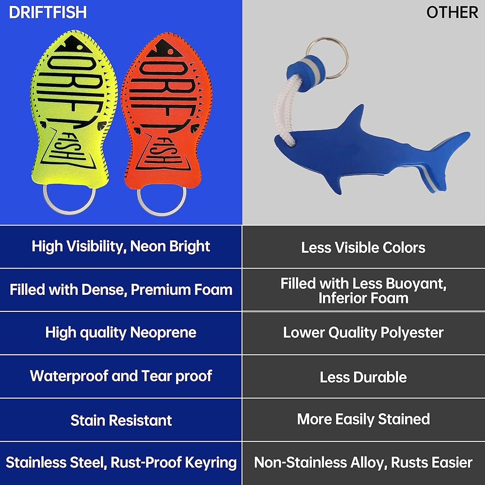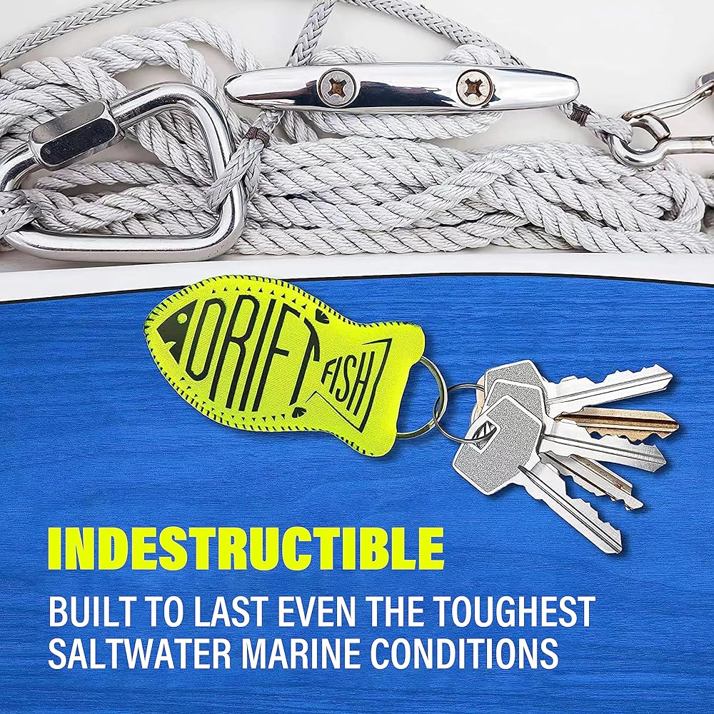 أداء عائم لا مثيل له: تتميز سلسلة المفاتيح العائمة الخاصة بنا لمفاتيح القارب بمادة النيوبرين الساطعة وعالية الوضوح والمملوءة بالإسفنج والتي تحافظ على مفاتيحك طافية دون عناء. سلاسل المفاتيح العائمة من DriftFish للقوارب يمكن أن تدعم 5-6 مفاتيح أو حوالي 2.7 أونصة، مما يعكس أسلوب حياتك المليء بالمغامرات.