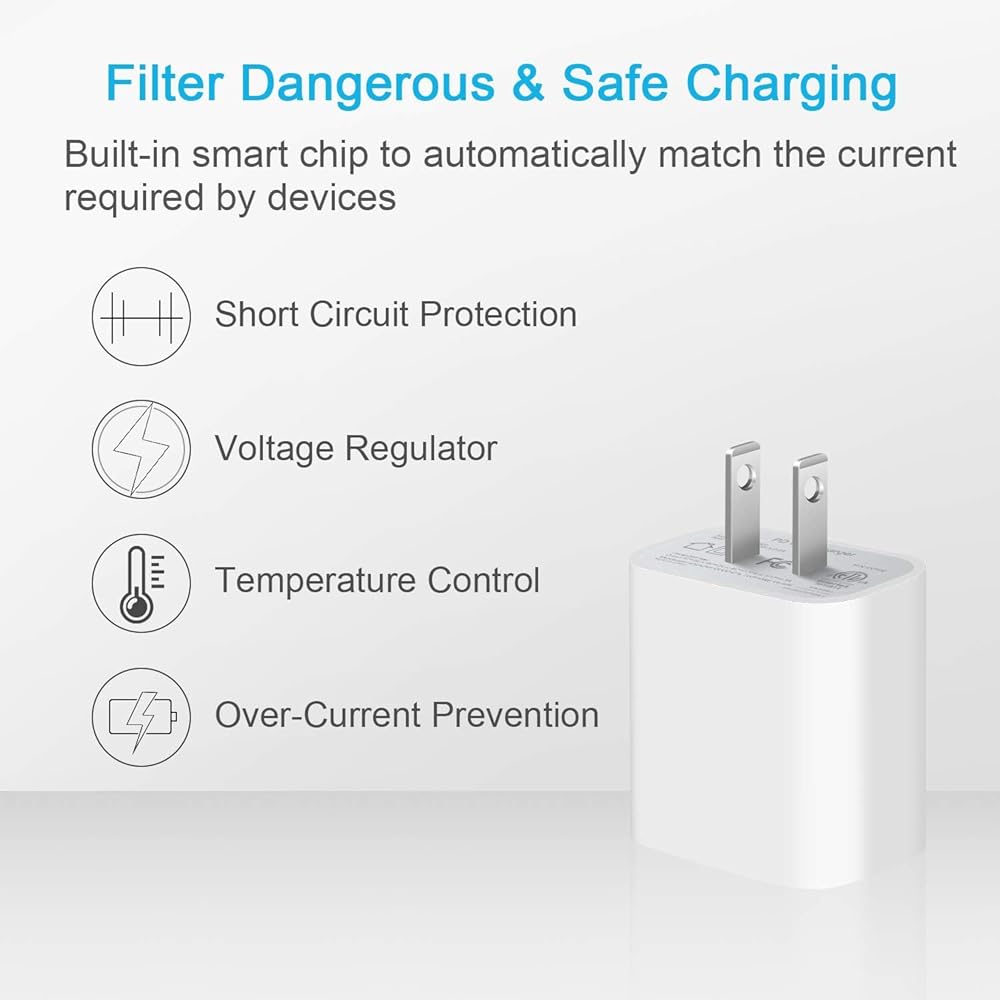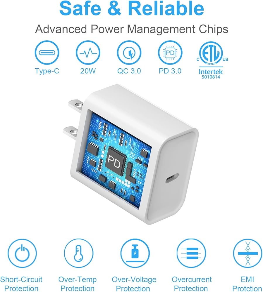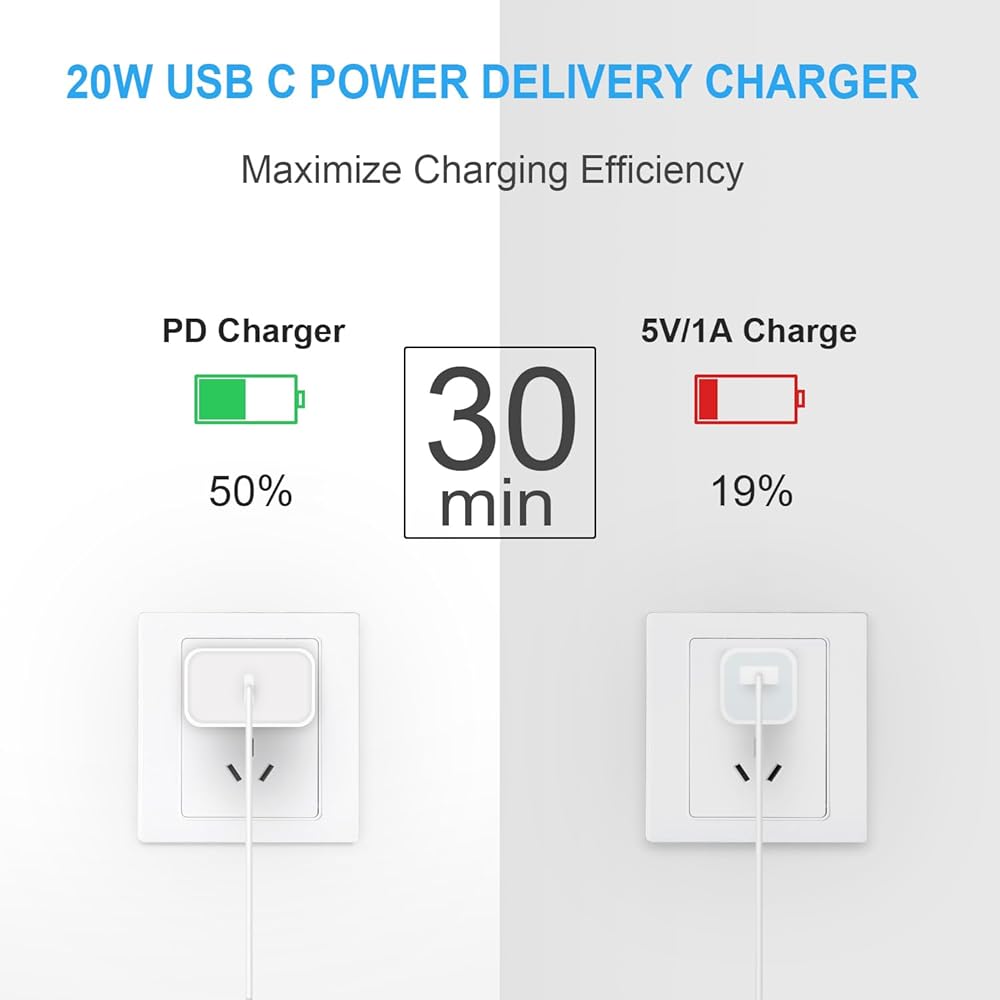 [شحن عالي السرعة] مصمم لمنفذ توصيل الطاقة USB-C، محول الطاقة USB-C بقدرة 20 وات يدعم سرعة الشحن السريع من خلال تقنية PD 3.0 الذكية. قم بشحن هاتف iPhone 15 الخاص بك بنسبة تصل إلى 50% خلال 30 دقيقة فقط، وهو أسرع بنسبة 75% من شاحن USB القياسي. توفير أكثر من 1.5 ساعة بالنسبة لك.