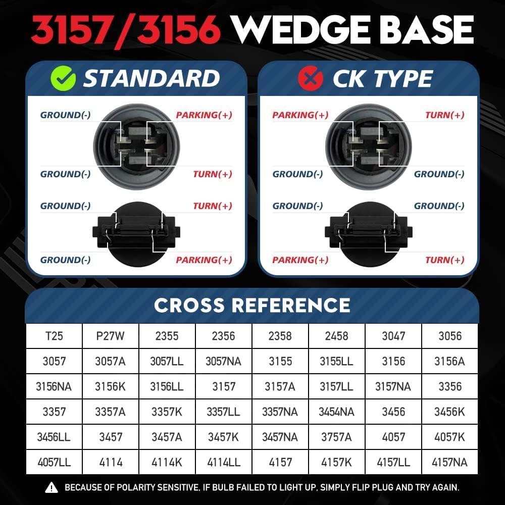 Fitment: T25, P27W, 2355, 2356, 2358, 2458, 3047, 3056, 3057, 3057A, 3057LL, 3057NA, 3057ST, 3155, 3155LL, 3156, 3156A, 3156NA, 3156AK, 3156K, 3156LL, 3156ST, 3157, 3157A, 3157LL, 3157NA, 3157ST, 3157X, 3356, 3357, 3357A, 3357K, 3357LL, 3357NA, 3454NA, 3456, 3456K, 3456LL, 3457, 3457A, 3457AK, 3457K, 3457NA, 3757A, 3757AK, 3757ALL, 4057, 4057K, 4057LL, 4114, 4114K, 4114LL, 4157, 4157K, 4157LL, 4157NA, 5702A, 5702AK