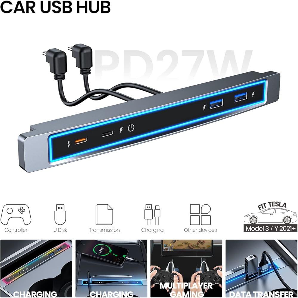 【أربعة منافذ】من مركز Tesla Usb C هذا، سوف تحصل على منفذين إضافيين. شحن USB-C1 PD27W، شحن USB-C2 7.5 واط ونقل البيانات، شحن USB-A1 7.5 واط ونقل البيانات، شحن USB-A2 7.5 واط ونقل البيانات، ينطبق على الهواتف الذكية، iPad، لوحة الألعاب، الكمبيوتر اللوحي، الكاميرا الرقمية. إذا كانت وحدة التحكم المركزية الخاصة بك لا تدعم نقل البيانات، فإن المحور لا يدعم نقل البيانات.