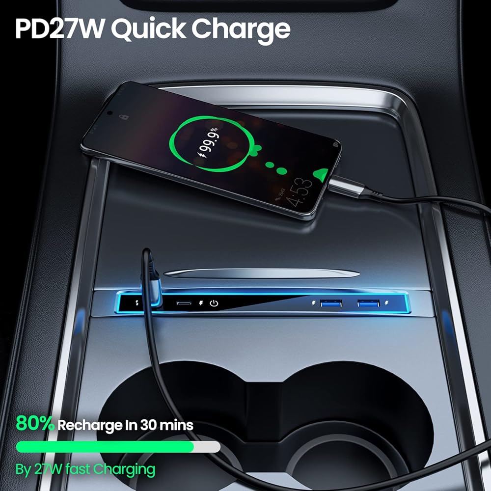 【شحن سريع PD 27 وات】يحتوي محور Tesla Model Y Usb C على منفذ USB C واحد يدعم الشحن السريع PD 27W. ولكنه يتطلب أن يدعم جهازك 27 وات، يمكن أن يدعم كابل الشحن الخاص بجهاز Iphone الجديد 20 وات فقط (PD2.0)، إذا كنت تريد دعم 27 واط، فأنت بحاجة إلى شراء كابل شحن إضافي بشكل منفصل (PD3.0).
