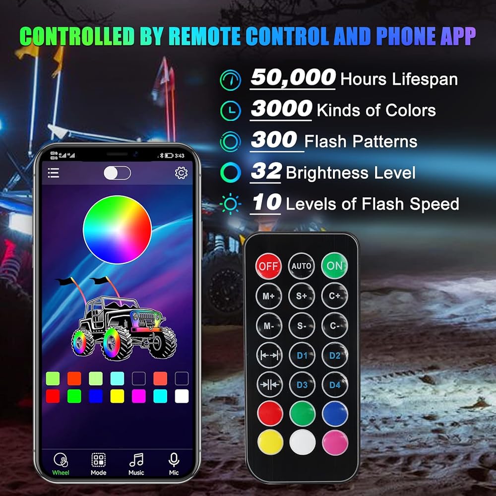 ✅الإزالة والتحكم في التطبيق: سوف تحصل على زوج من مصابيح السوط RGB LED الحلزونية بطول 3 أقدام وقيادة UTV بأسلوبك. استخدم جهاز التحكم عن بعد أو التطبيق لتغيير أكثر من 3000 لون، و300 نمط نبض، و32 مستوى سطوع، و10 سرعات فلاش، مما يجعلك مميزًا. إنها مشرقة ومرئية وجميلة.