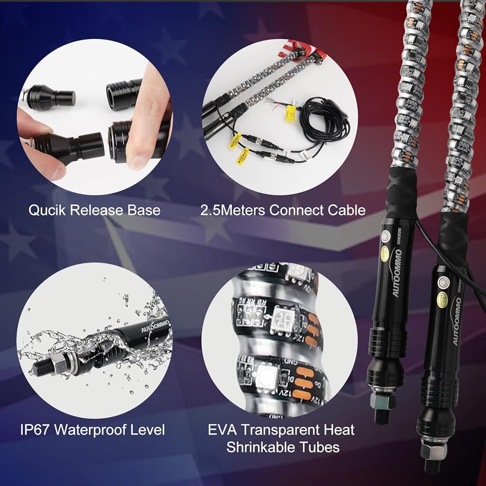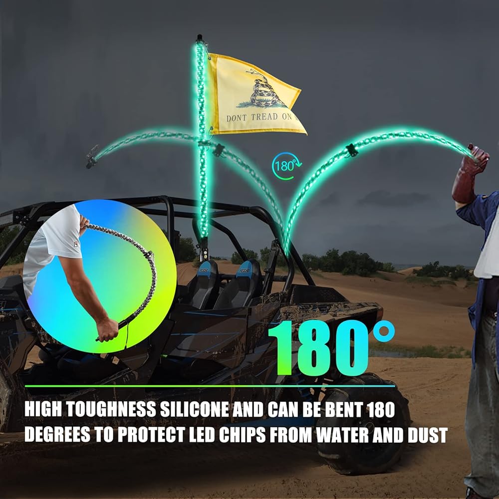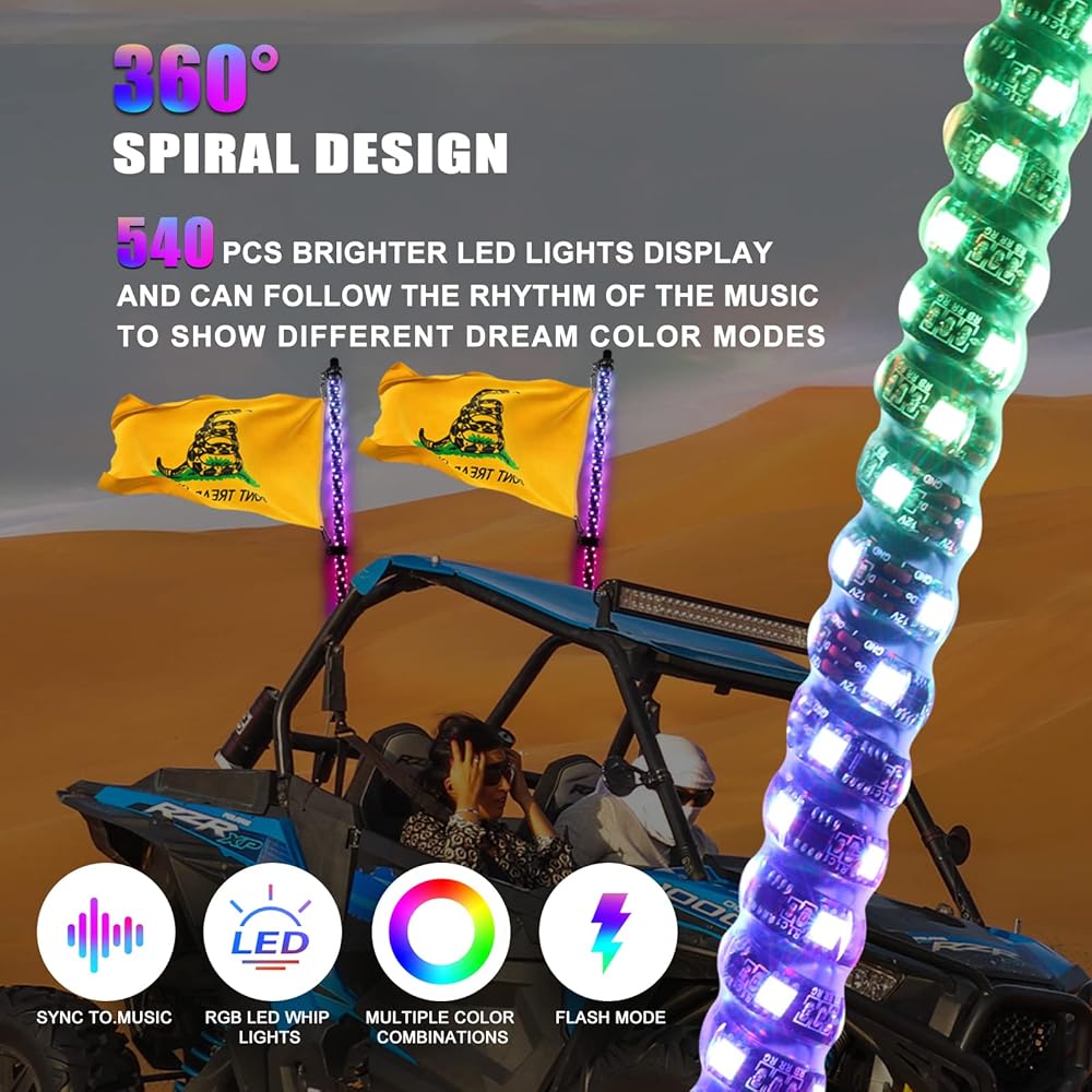 ✅تصميم حلزوني 360 درجة: يستخدم ضوء السوط تصميم إضاءة حلزوني 360 درجة، مجهز بأكثر من 320 مصباح LED ساطع، ويمكنه عرض أوضاع ألوان أحلام مختلفة وفقًا لإيقاع الموسيقى؛ مناسبة للشاحنات، والشاحنات الصغيرة، وUTV، وATV، وRZR، وCan-am، وDune Buggy، وSand Rail، وFour Wheeler، وKart، والدراجات النارية، وغيرها من المركبات.