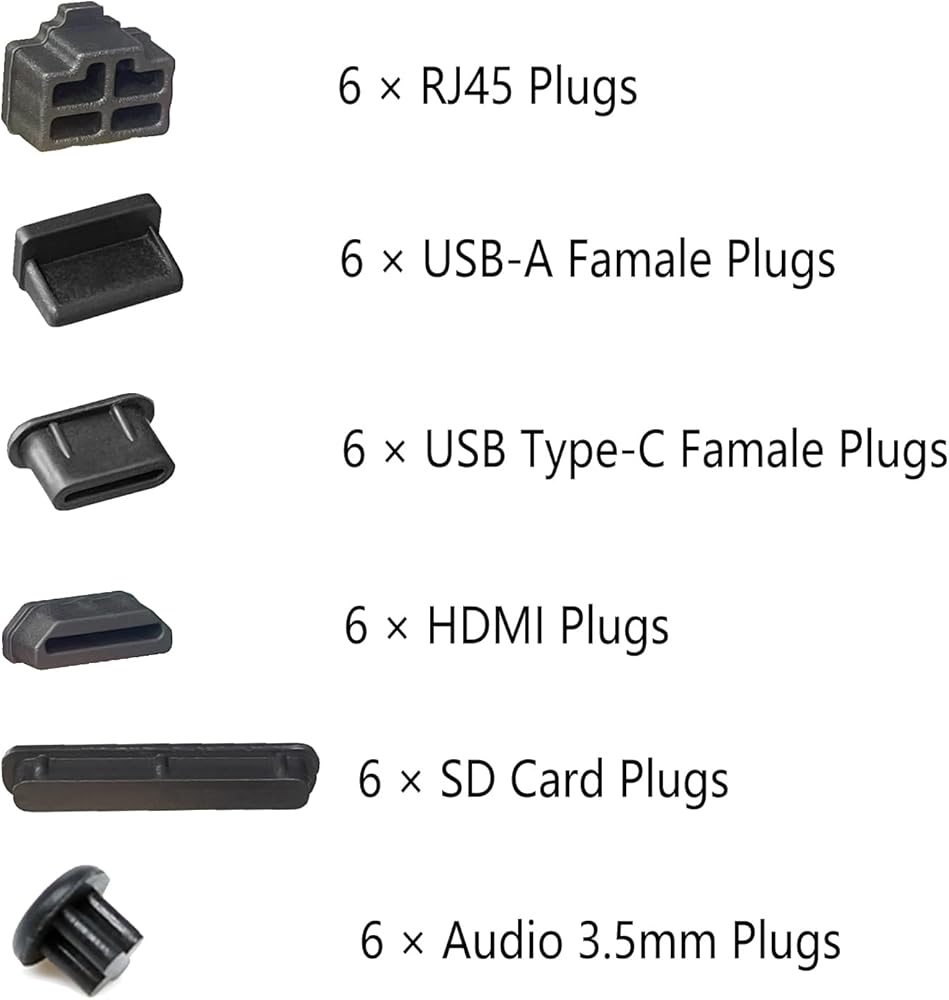 تشمل العبوة: 6 قطع من مقابس RJ45، 6 قطع من مقابس USB A أنثى، 6 قطع من مقابس USB من النوع C، 6 قطع من مقابس فتحة بطاقة SD، 6 قطع من مقابس الصوت 3.5 ملم، 6 قطع من مقابس HDMI. إجمالي 36 قطعة 6 أنواع من سدادات السيليكون الناعمة المضادة للغبار (حافظة الكمبيوتر المحمول وسدادات الغبار لمنفذ الكمبيوتر المحمول).