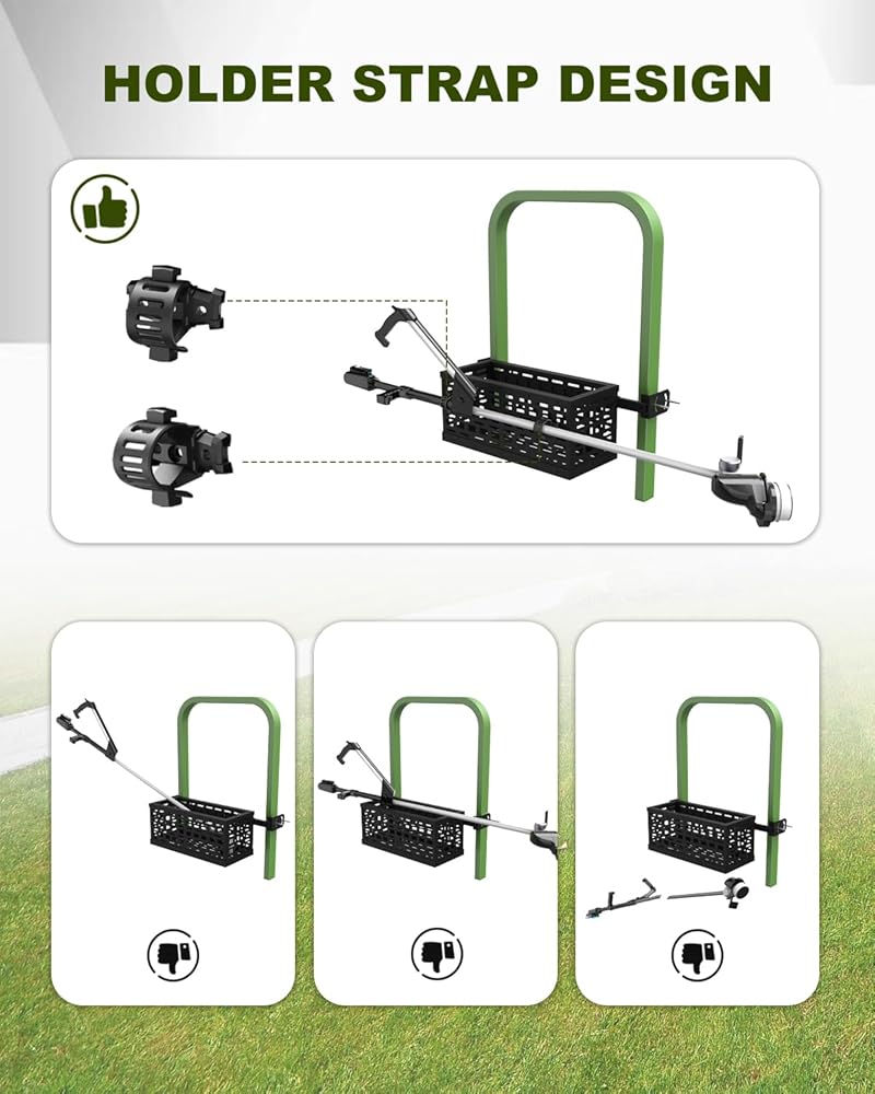 • ملحقات الحزام المتضمنة مع صينية أدوات الجرار تسمح بالنقل الآمن للأدوات مثل المجارف أو جزازات العشب، مما يمنع أي خسارة أو ضرر محتمل ناجم عن مطبات الطريق.