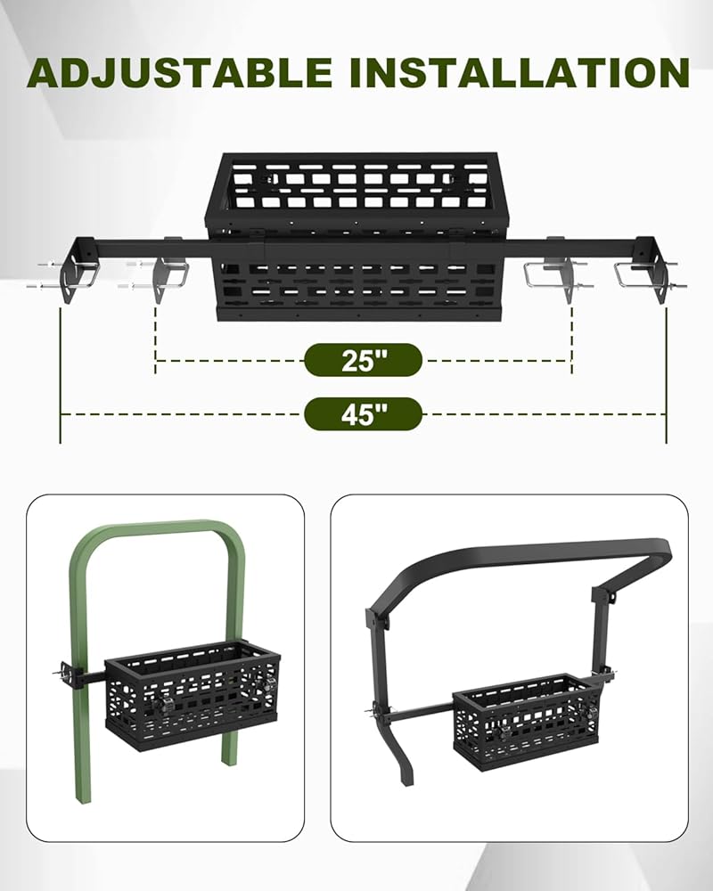 • صندوق أدوات الجرار يناسب الجرارات المزودة بقضبان هيكل الحماية من الانقلاب (ROPS) التي يتراوح عرضها بين 25 و45 بوصة. الوظيفة القابلة للتعديل خلف حامل الأدوات يساعد على التكيف مع نماذج جرارات جون ديري/كوبوتا