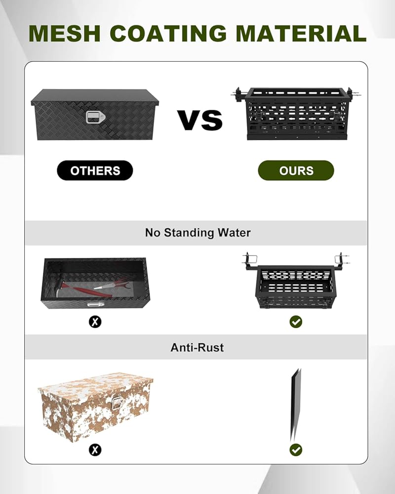 • 𝐌𝐄𝐒𝐇 𝐂𝐎𝐀𝐓𝐈𝐍𝐆 𝐌𝐀𝐓𝐄𝐑𝐈𝐀𝐋:يتميز حامل الجهاز بتصميم شبكي مزود بطبقة مزدوجة الطبقة لتعزيز الحماية، مما يسمح بتصريف مياه الأمطار بسهولة. وهذا يمنع تراكم الماء، مما يقلل من خطر الصدأ وتلف الأدوات الموجودة داخل الصندوق.