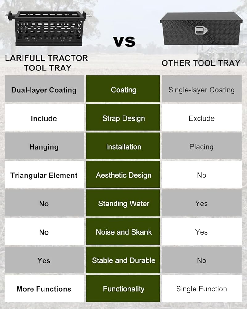 • يمكن أن يساعد صندوق أدوات الجرار في إضافة مساحة إضافية للجرار لتخزين العناصر الضرورية وتنظيم الأدوات مثل الحبال والمقص والمطارق والمناشير وعلب الزيت وغيرها من المعدات، أنه يمكن العثور بسهولة على هذه الأدوات عند العمل الخارج.