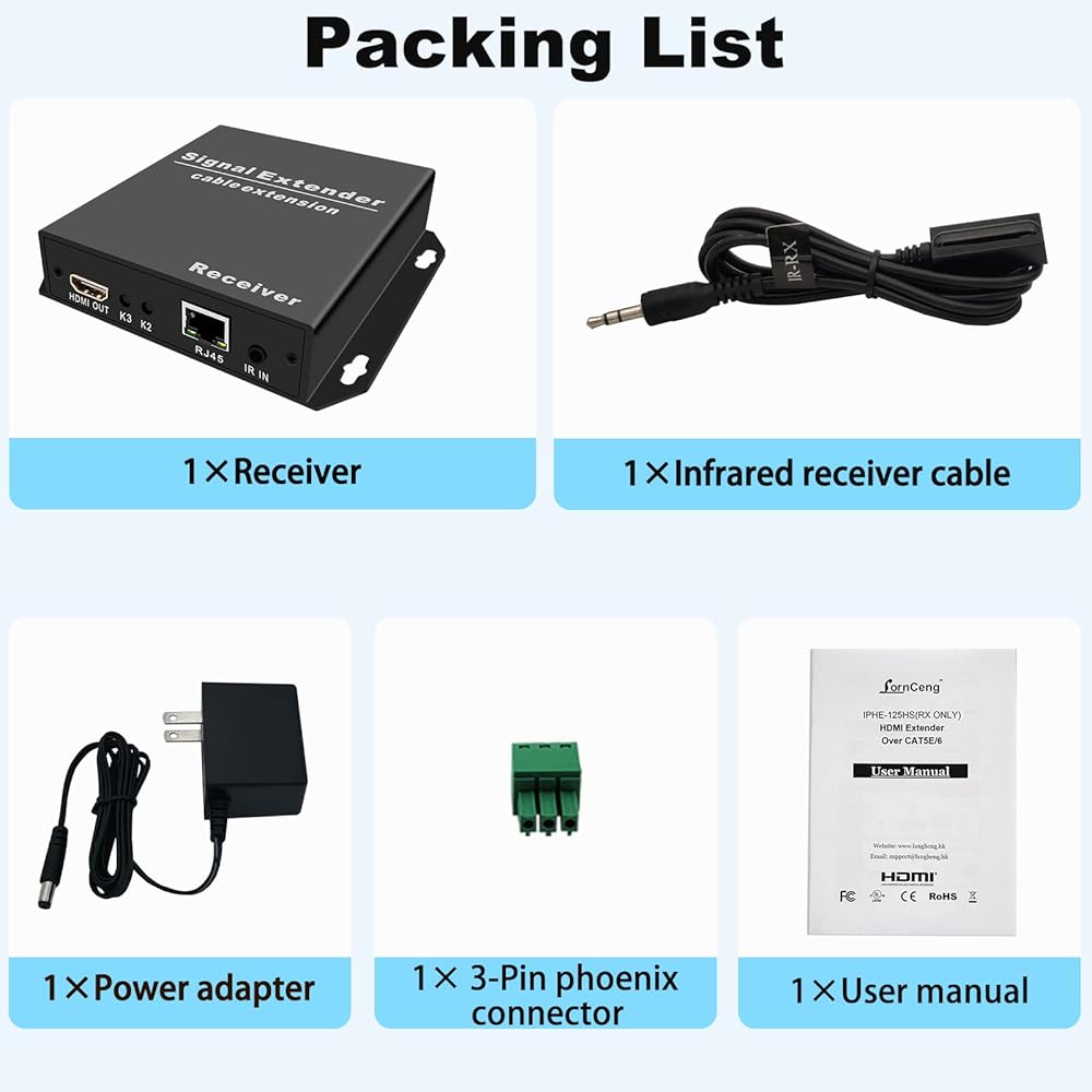 • 🔲 【موسع HDMI عبر إيثرنت 】يستقبل HDMI RX إشارة HDMI 4K، IR، RS232 حتى 410 قدم عبر كابل CAT5E/6/7. زمن الوصول للفيديو صفر. *ملاحظة: نوصي باستخدام وصلات HDMI إلى HDMI المباشرة، وتجنب استخدام محولات الإشارة أو المحولات