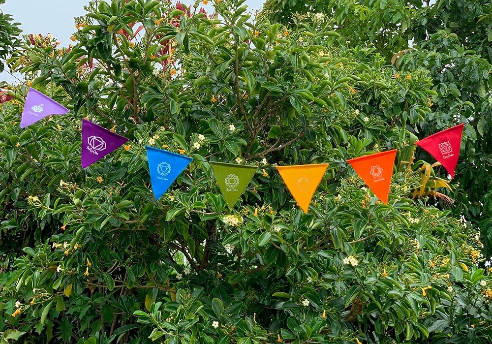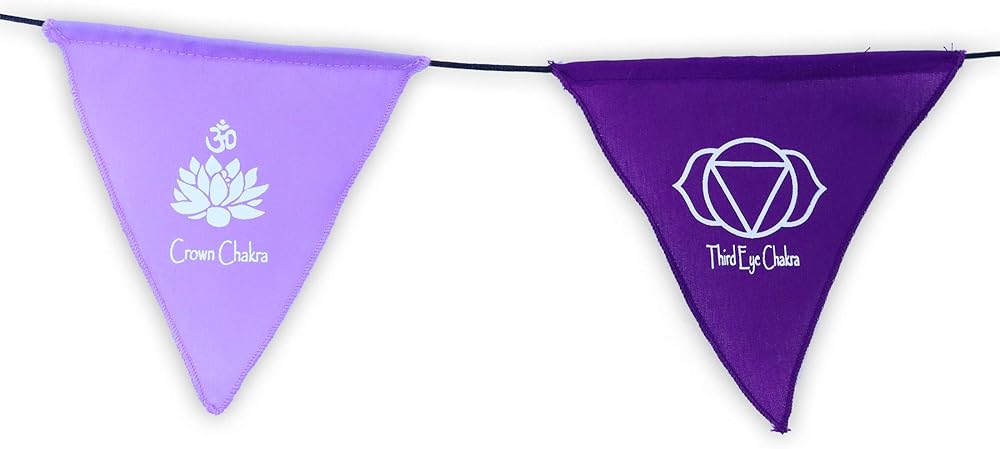 تساعد شاكرا العين الثالثة أو النيلية الشخص على تحقيق إمكاناته الكاملة والاستفادة من حدسه. تساعد شاكرا البنفسج أو التاج الشخص على تطوير روحانيته وثقته في الكون. هذه القائمة لأعلام الشاكرا السبعة على شكل مثلث. يبلغ مقاس كل علم 15.24 سم × 15.24 سم ويبلغ طول العلم 47 سم.