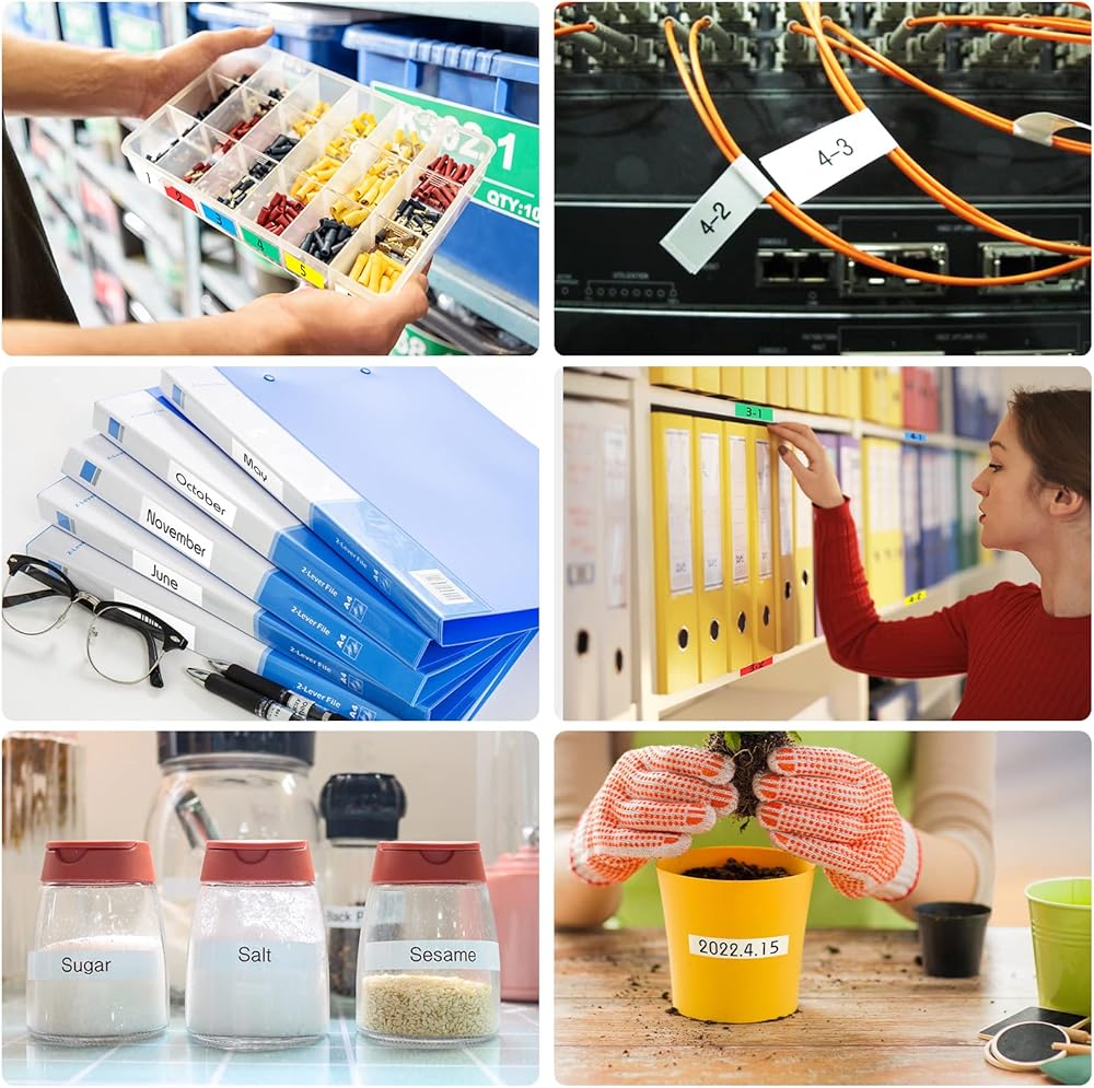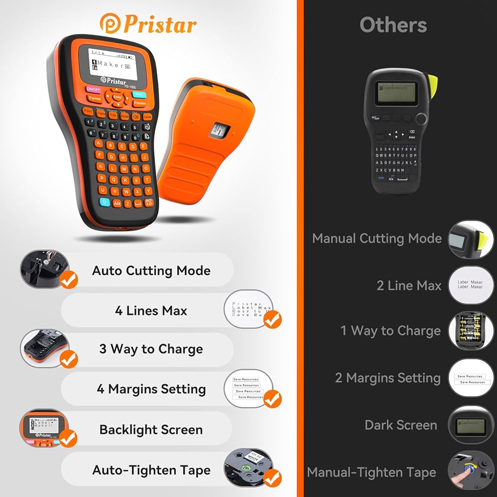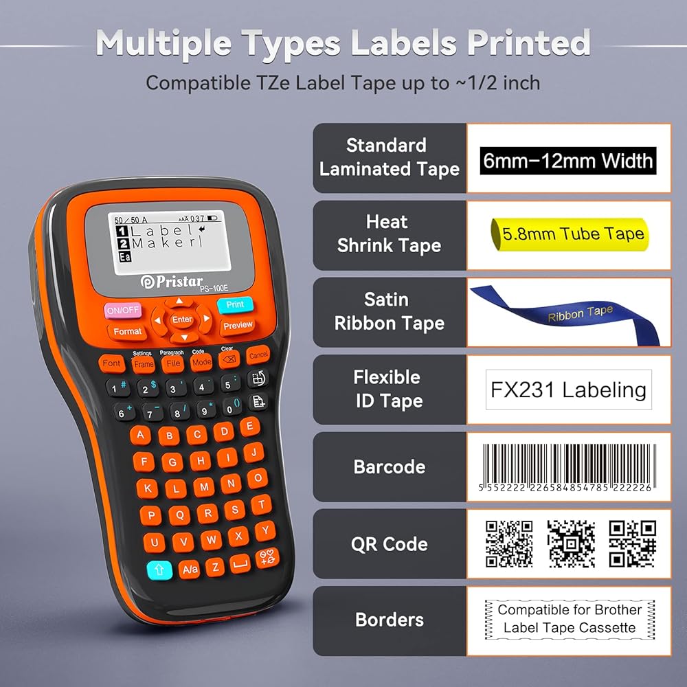 طباعة ملصقات متعددة - صانع الملصقات PS-100E المحمول من Pristar متوافق مع أشرطة الملصقات Brother TZe 0.13"-0.47" بمواد وألوان مختلفة، وتستخدم للشريط المصفح القياسي، وشريط القماش، والأشرطة الصناعية لأنابيب الانكماش الحراري، وأشرطة الهوية المرنة، والساتان أشرطة الشريط، الخ.